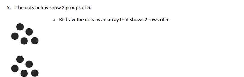 The dots show 2 groups of 5. Redraw the dots as an array that shows 2 rows of 5.
