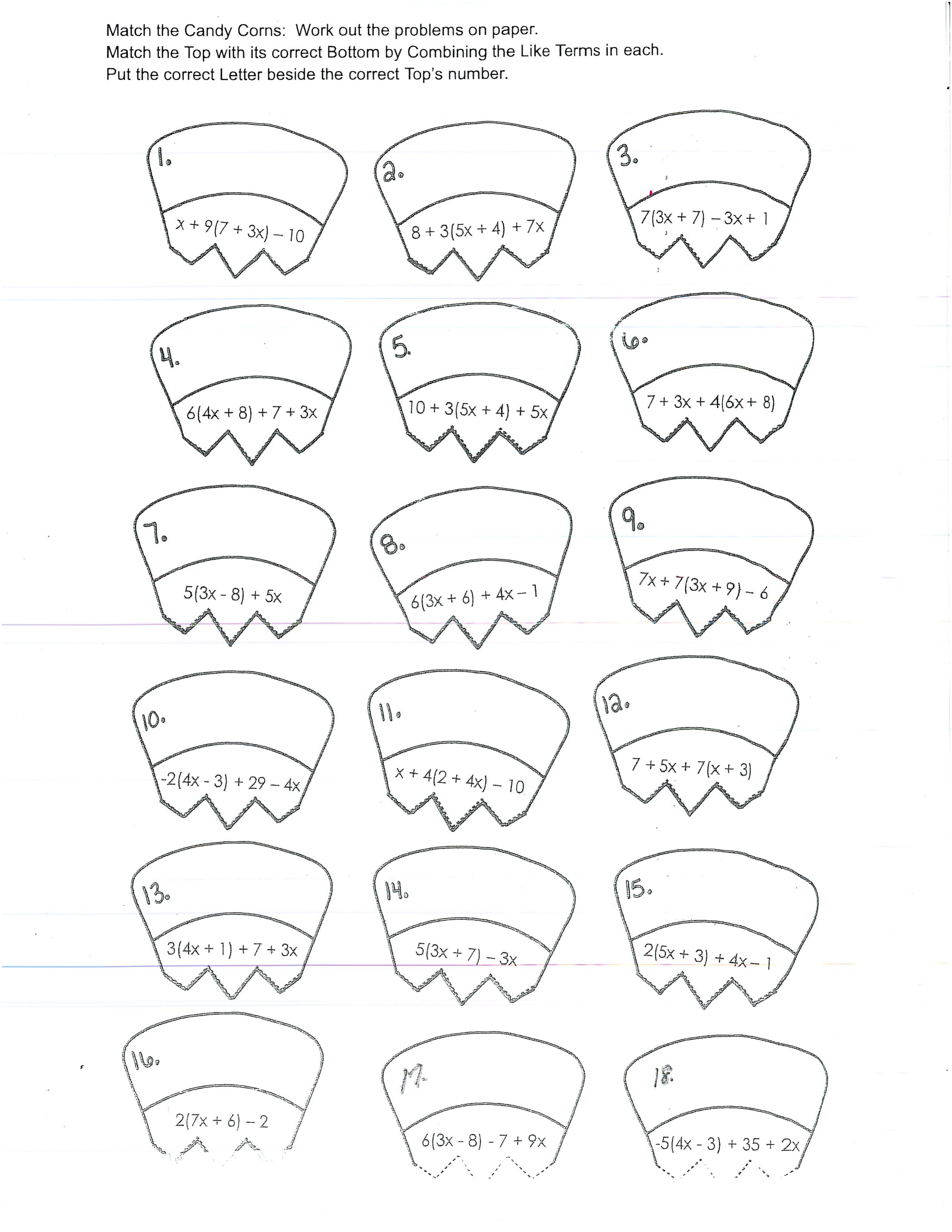 Combining like terms and finding answers with problems by matching the candy corn pairs. (Complements of TPT)