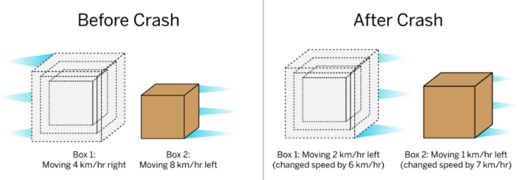 In a warehouse, the workers sometimes slide boxes along the floor to move them. Two boxes were sliding toward each other and crashed. The crash caused both boxes to change speed. Based on the information in the diagram, which statement is correct? In your answer, explain what the forces were like and why the boxes changed speed.