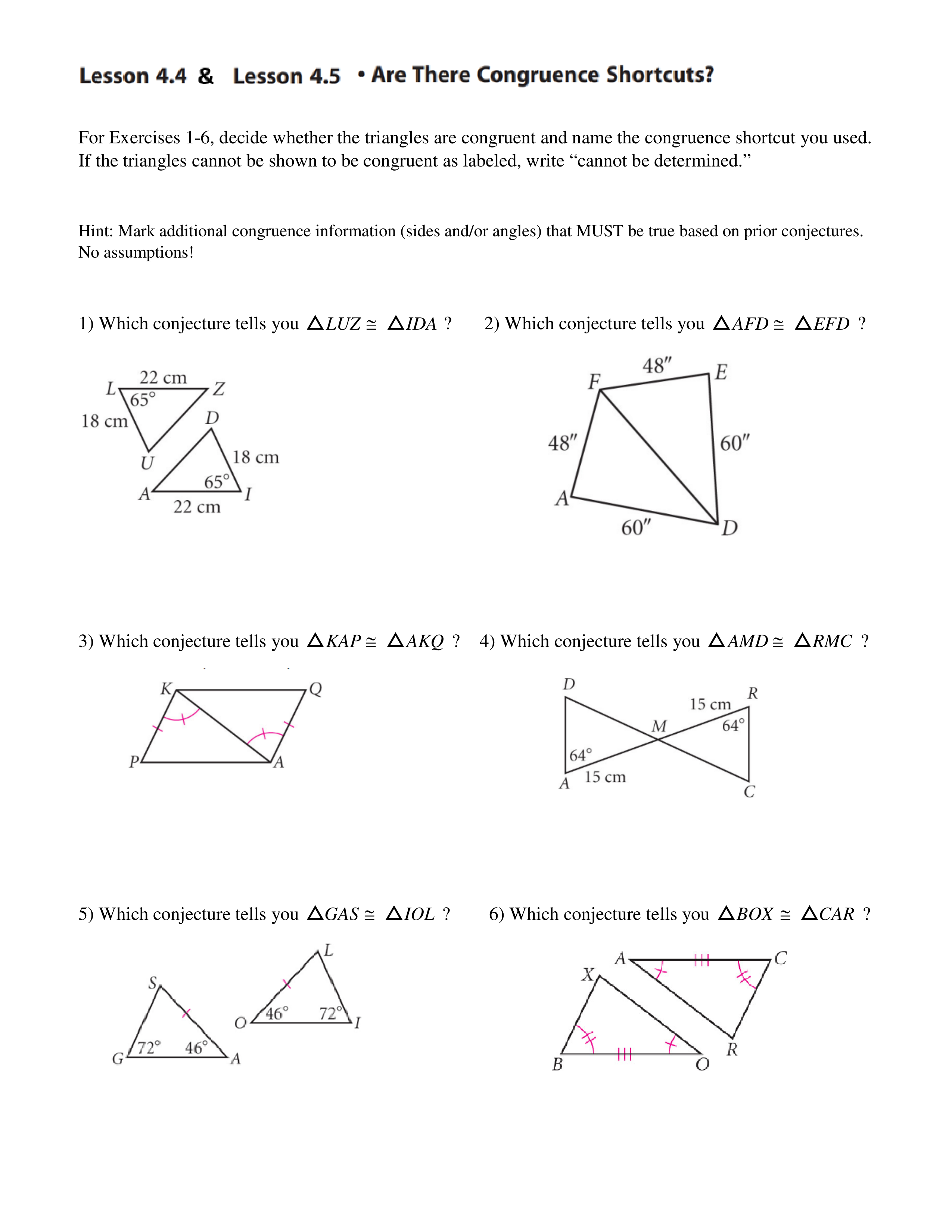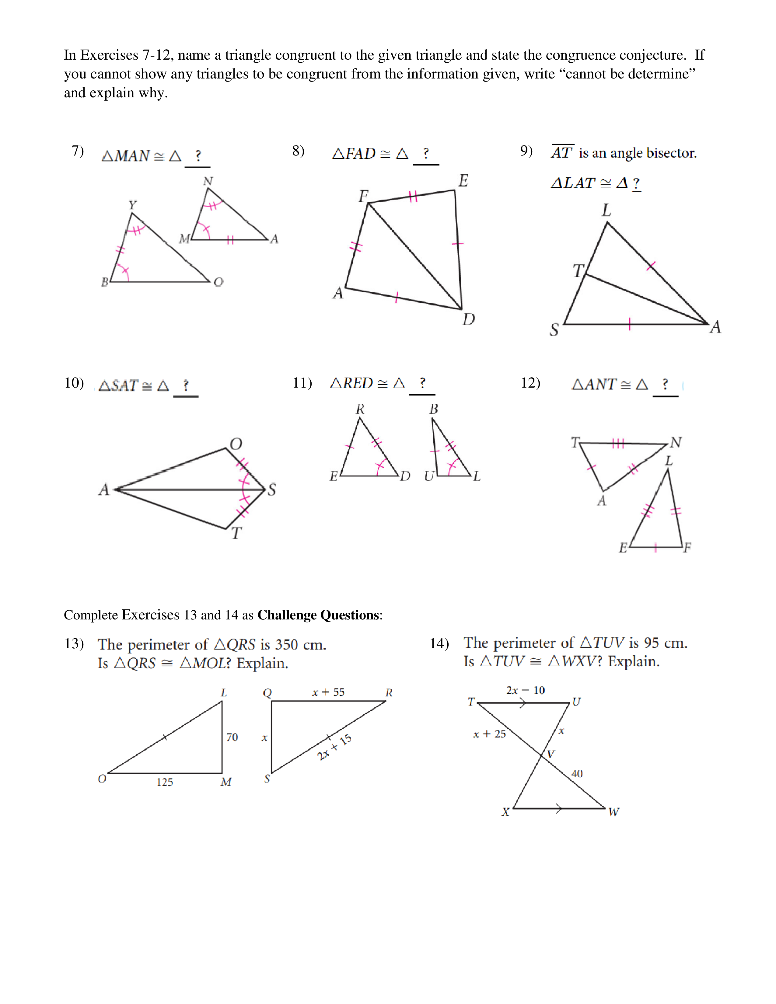 If a congruent triangle exists, remember to write the name of the triangle with the letters in order to match the first triangle, and state the congruence conjecture (ex: SAS). If no congruent triangle exists, write "cannot be determined" along with your reasoning.