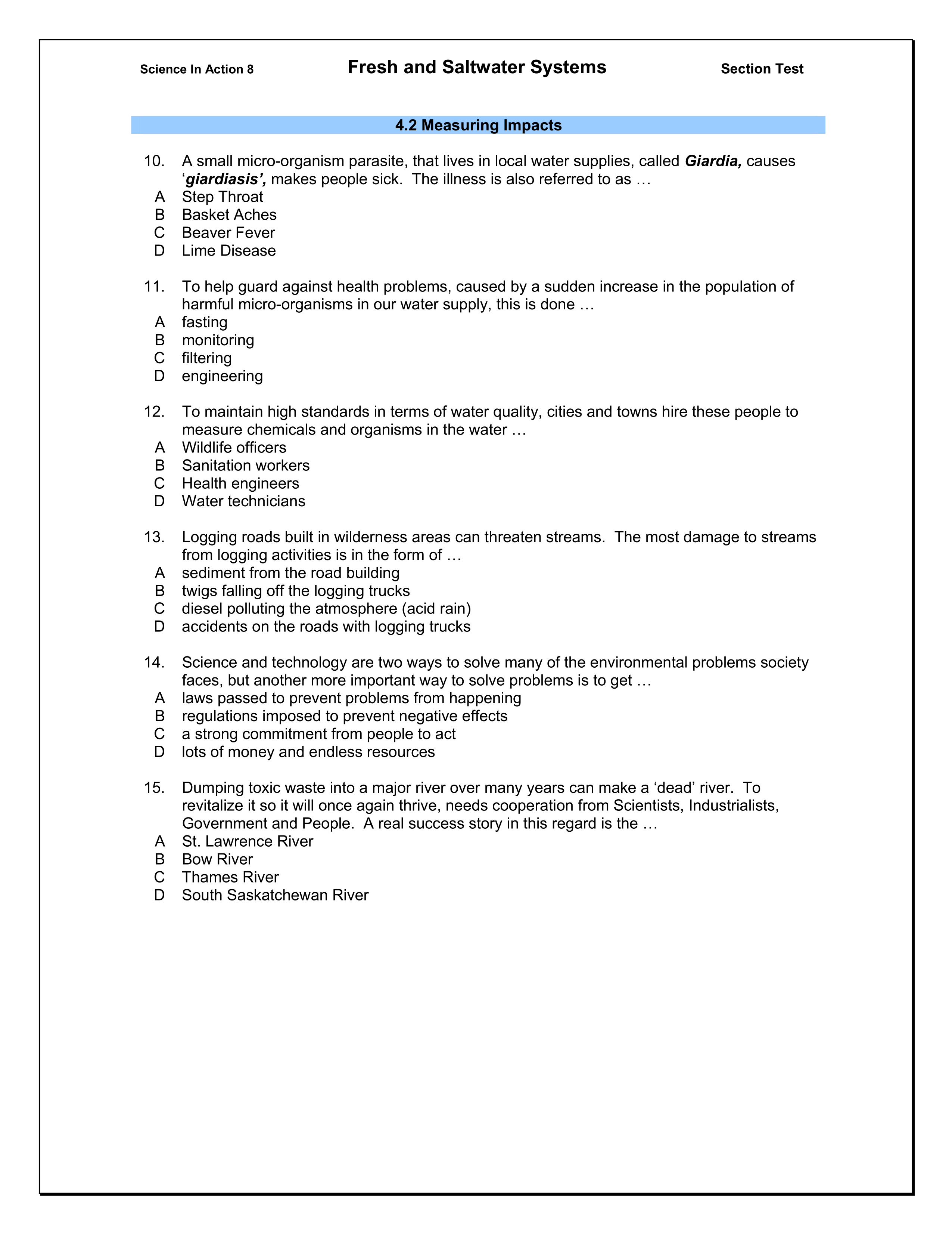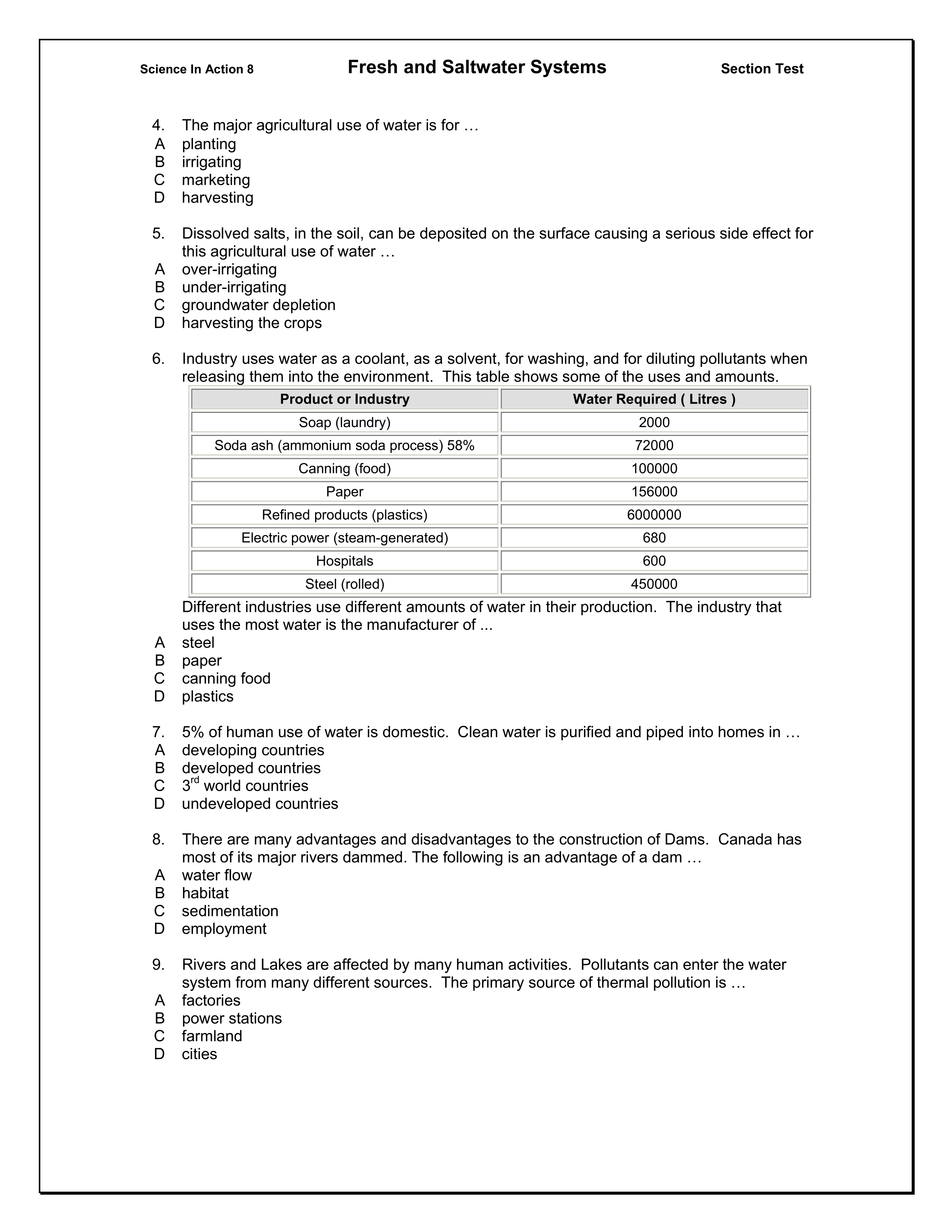 Grade 8 Science: Fresh and Saltwater Section 4.0 Quiz