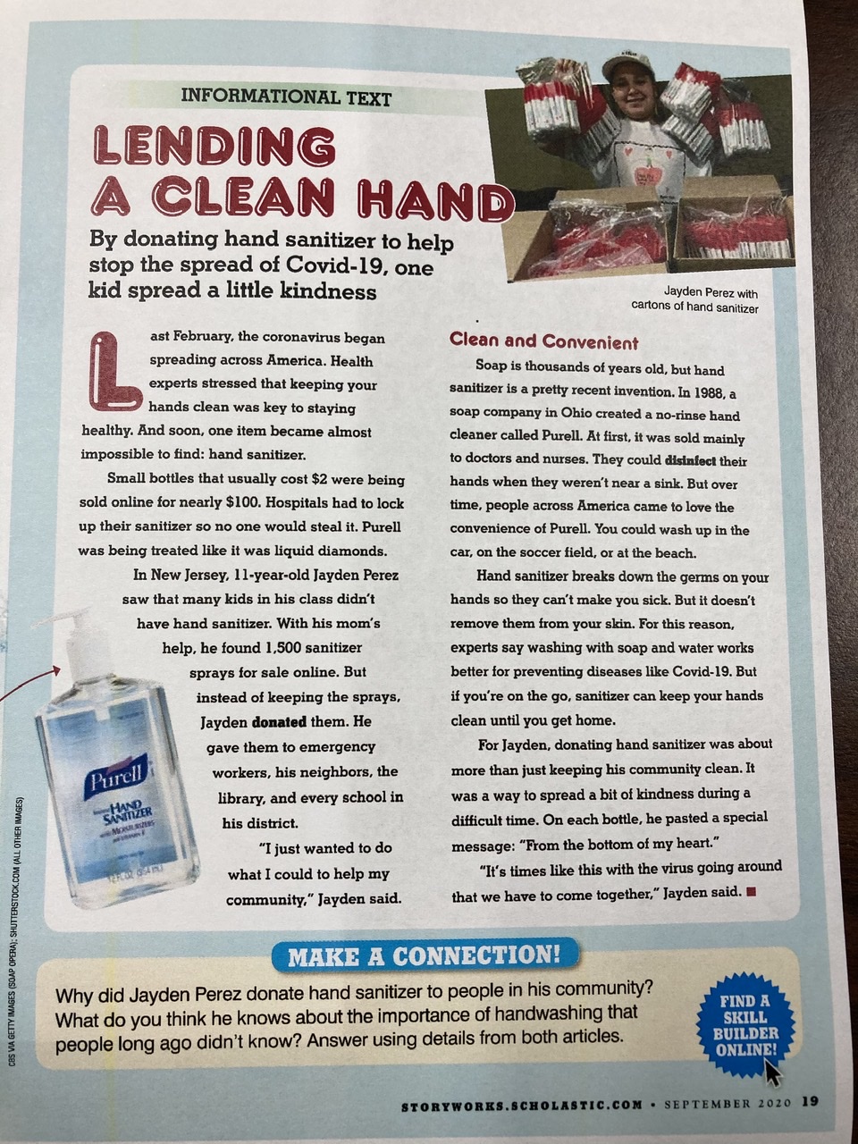 What are TWO reasons Jayden Perez collected and distributed hand sanitizer?