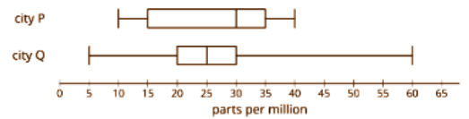 The air quality was tested in many office buildings in two cities. A level of less than 50 parts per million is considered healthy. A level of 50 or more parts per million is considered unhealthy. The results of the testing is shown in these box plots.