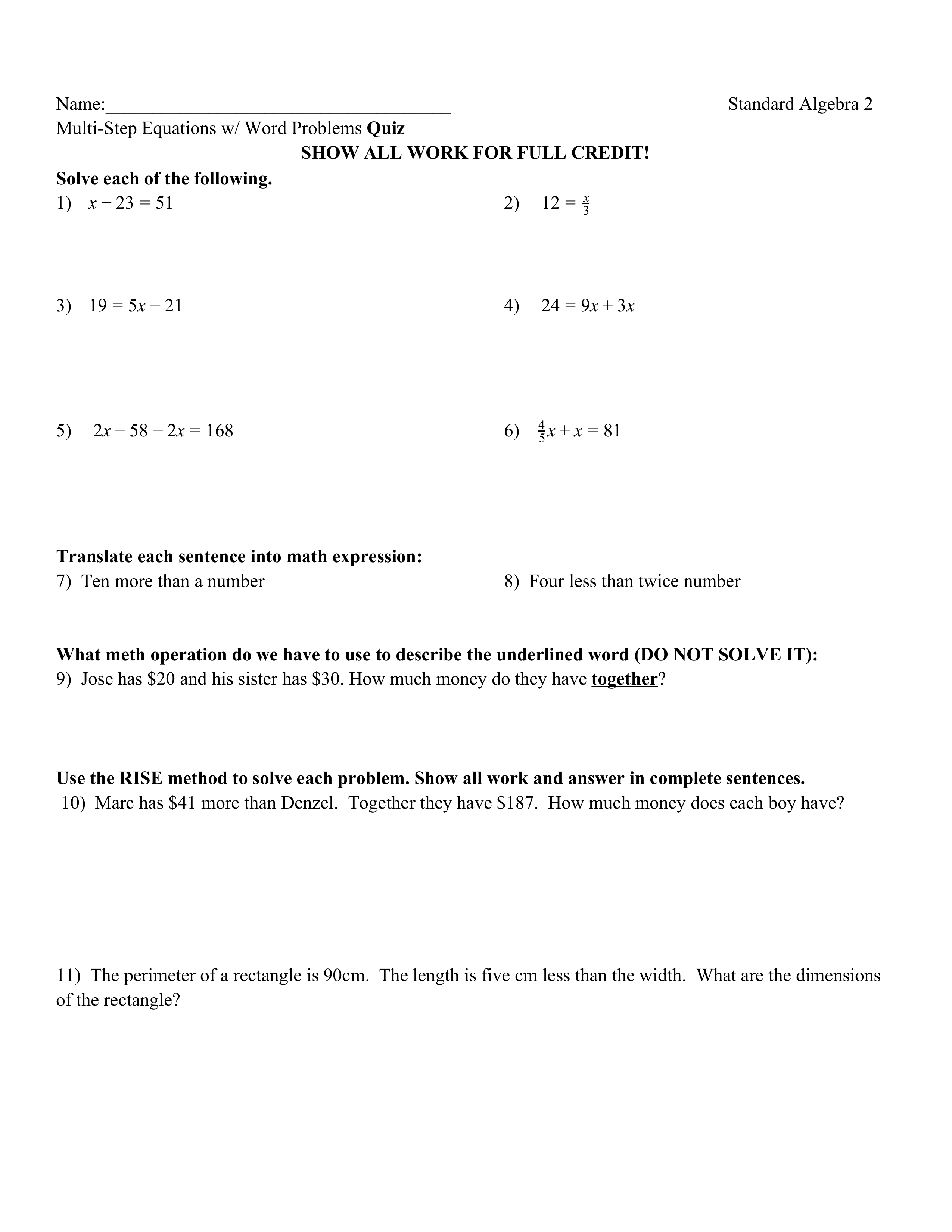 Use the RISE method to solve each problem. Show all work and answer in complete sentences.