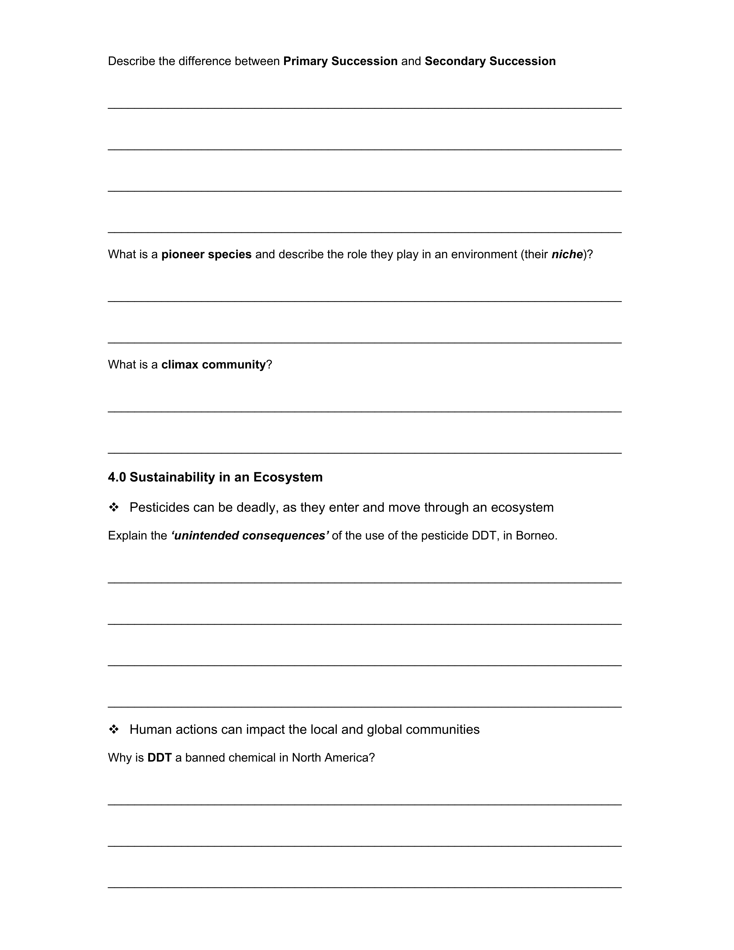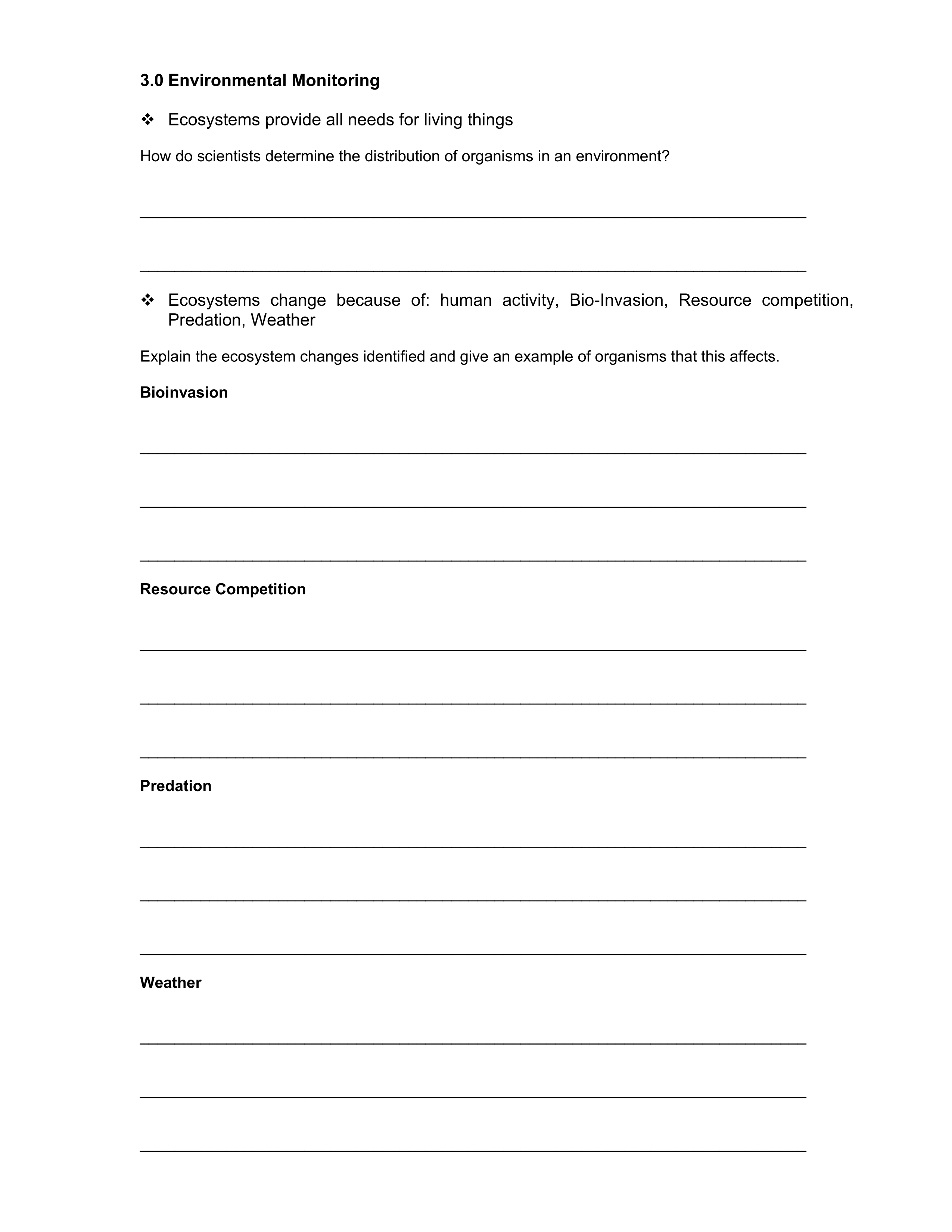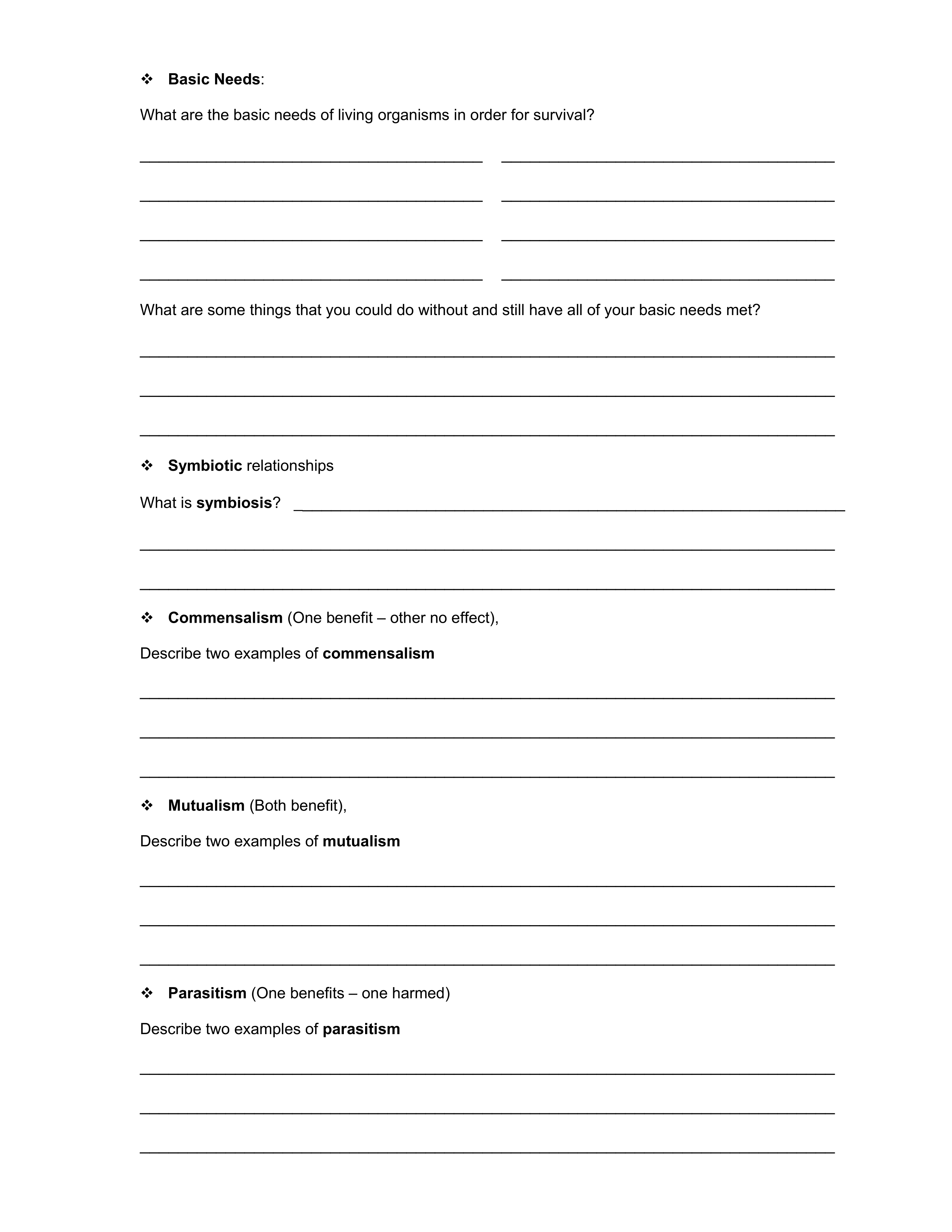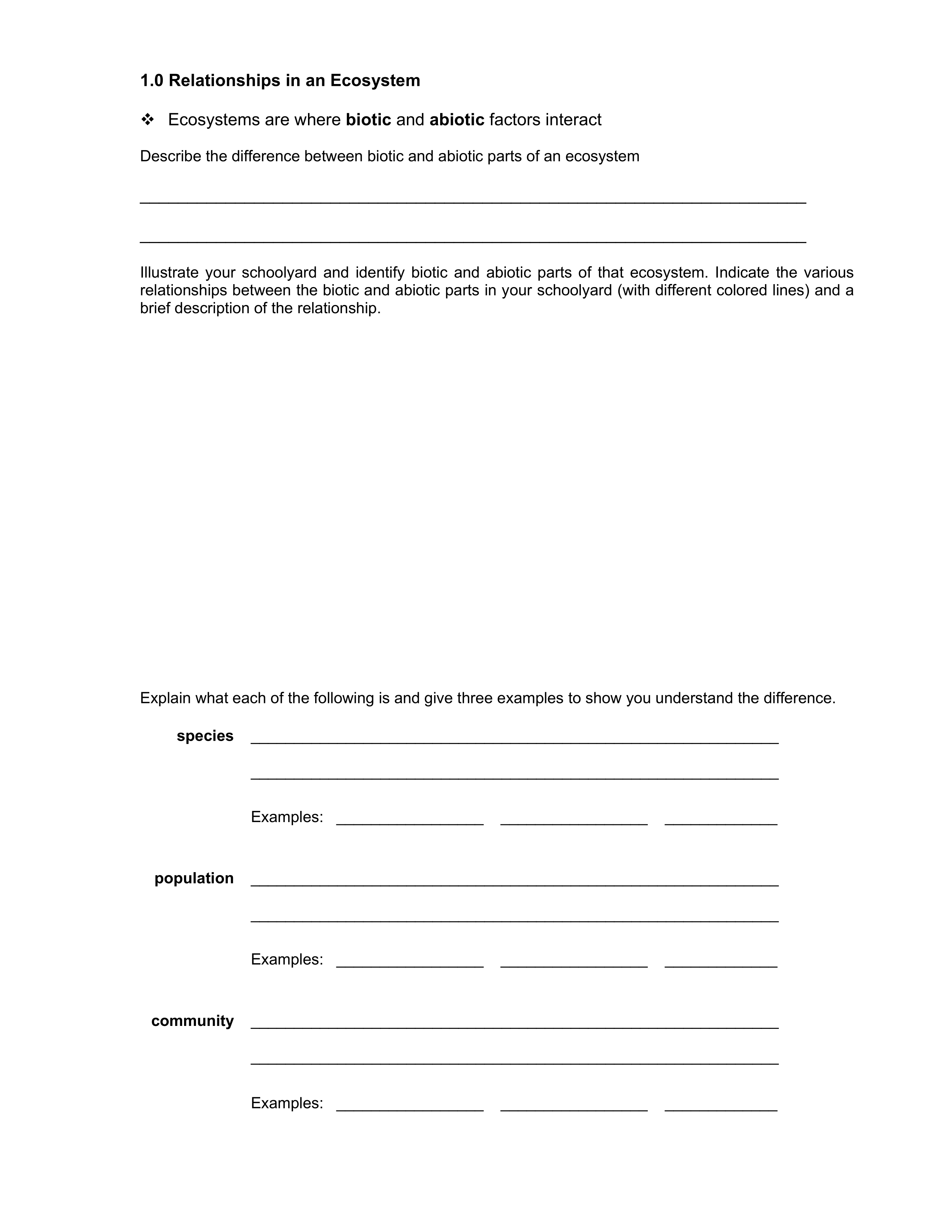 Illustrate your schoolyard and identify biotic and abiotic parts of that ecosystem. Indicate the various relationships between the biotic and abiotic parts in your schoolyard (with different colored lines) and a brief description of the relationship. (see page 10 of text)