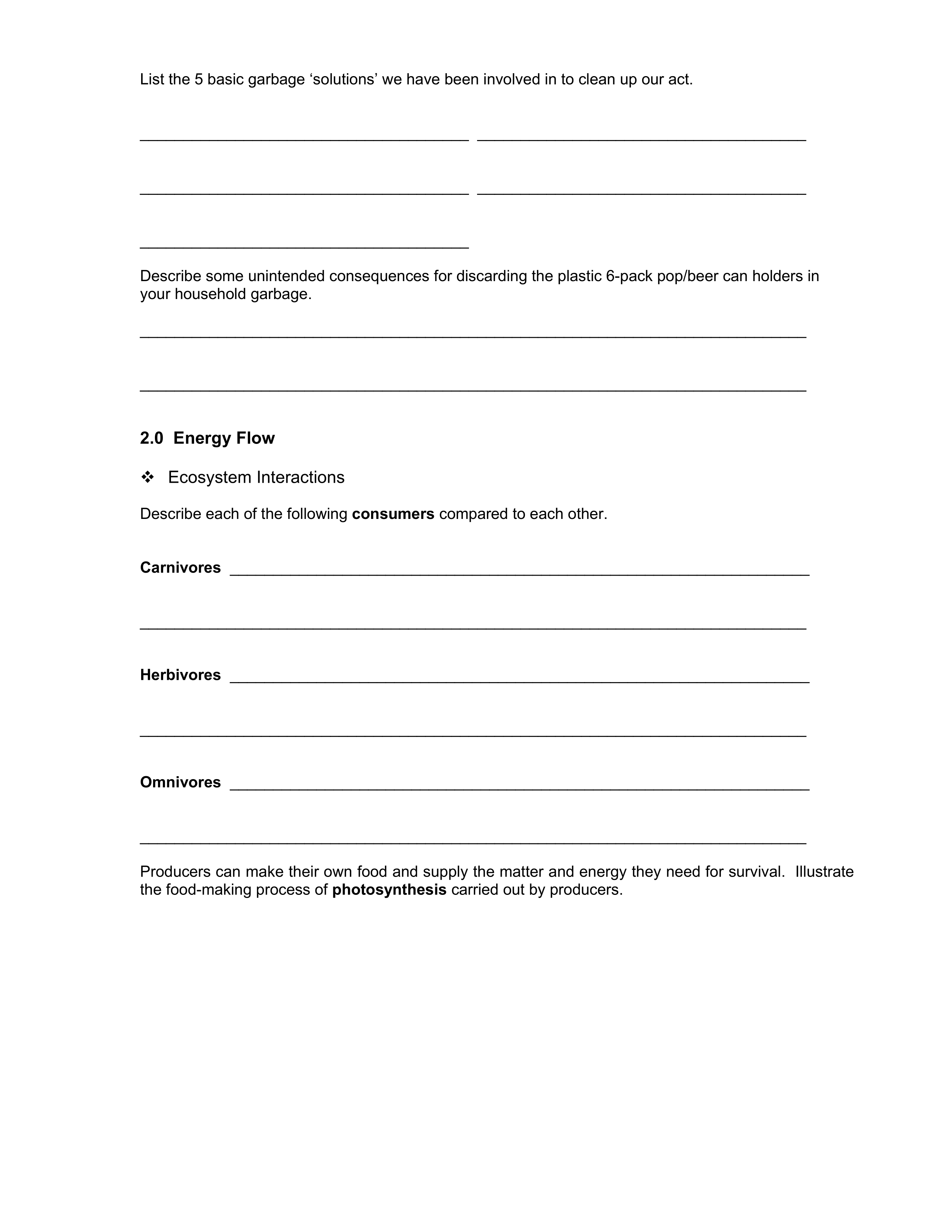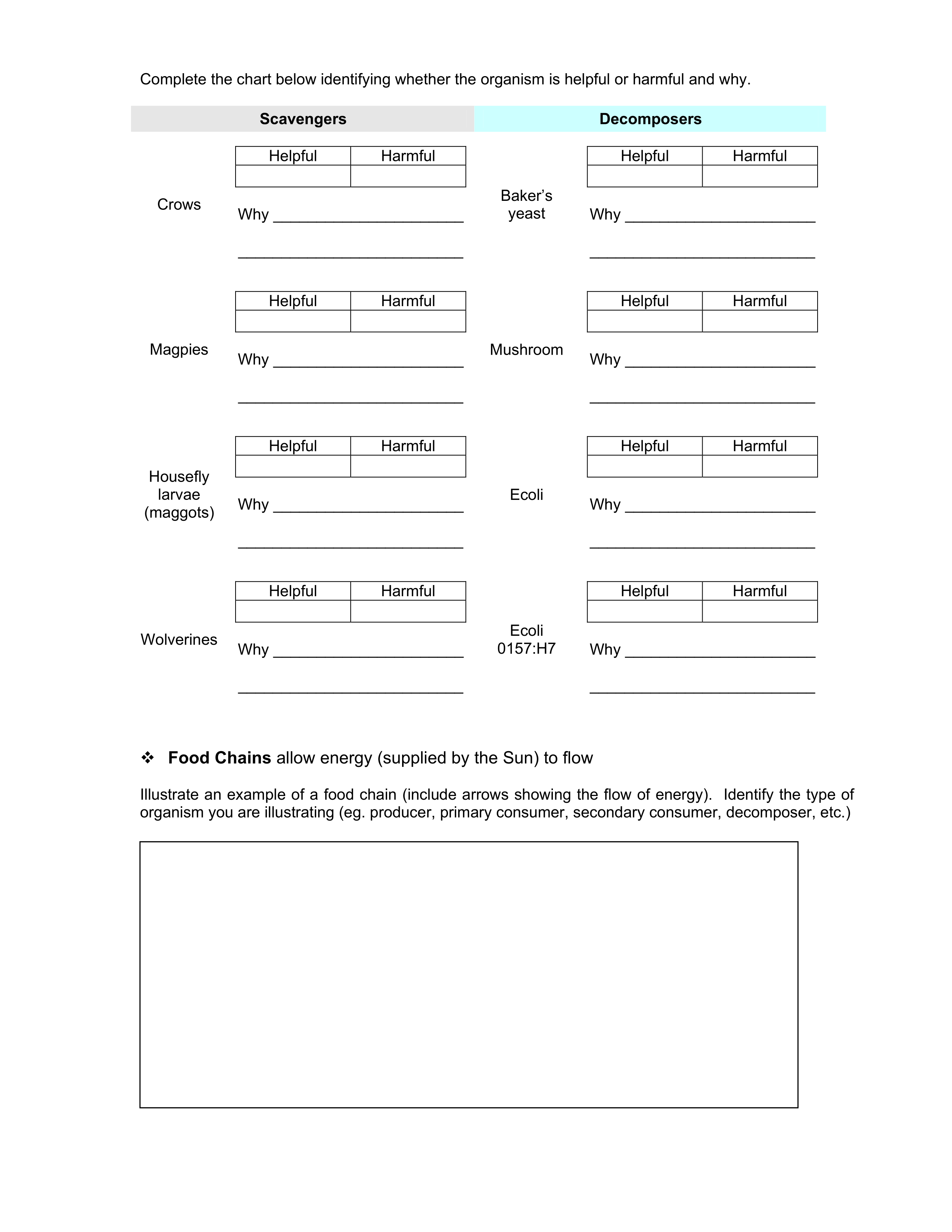 Illustrate the flow of energy from producer to primary consumer, to secondary consumer, to tertiaryconsumer, to scavenger, to decomposer.