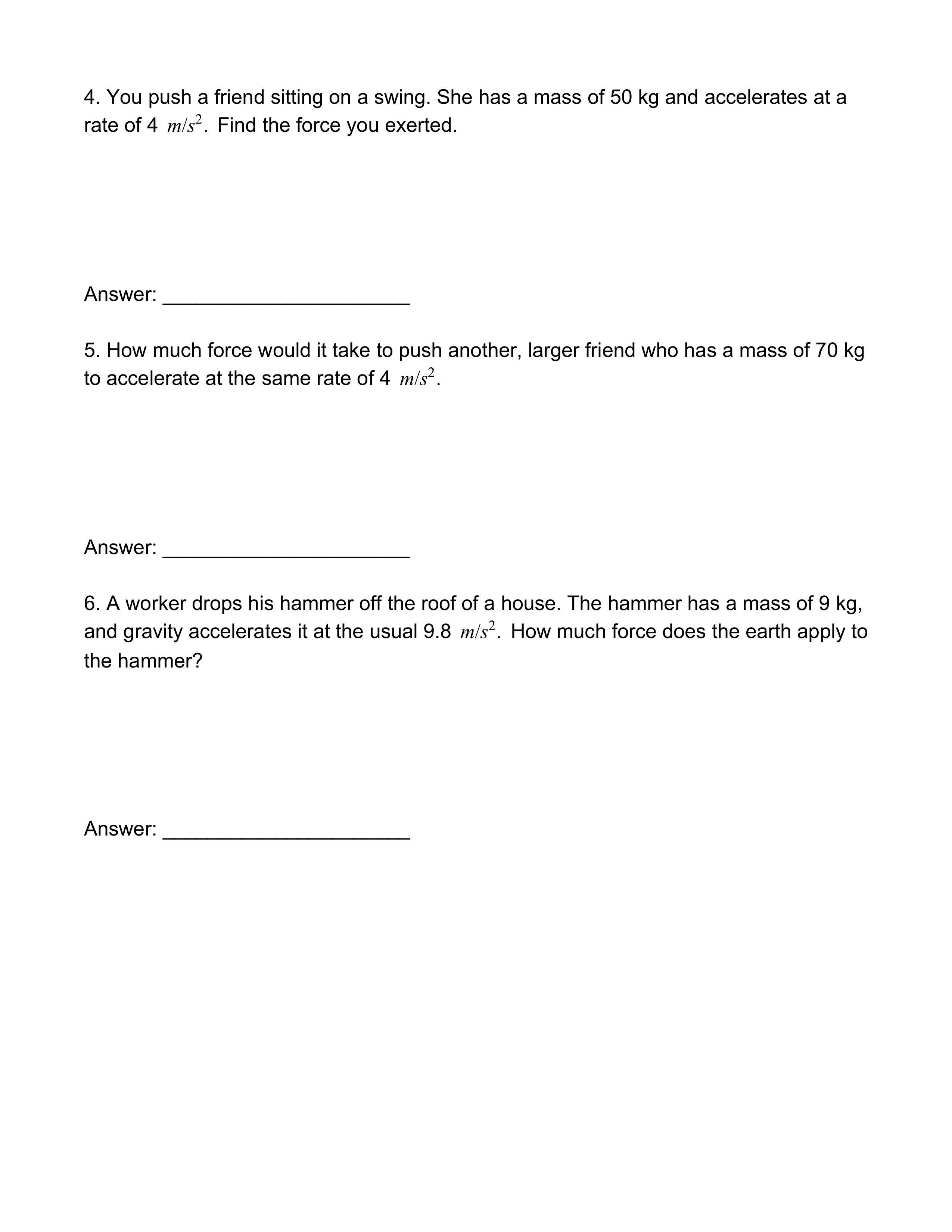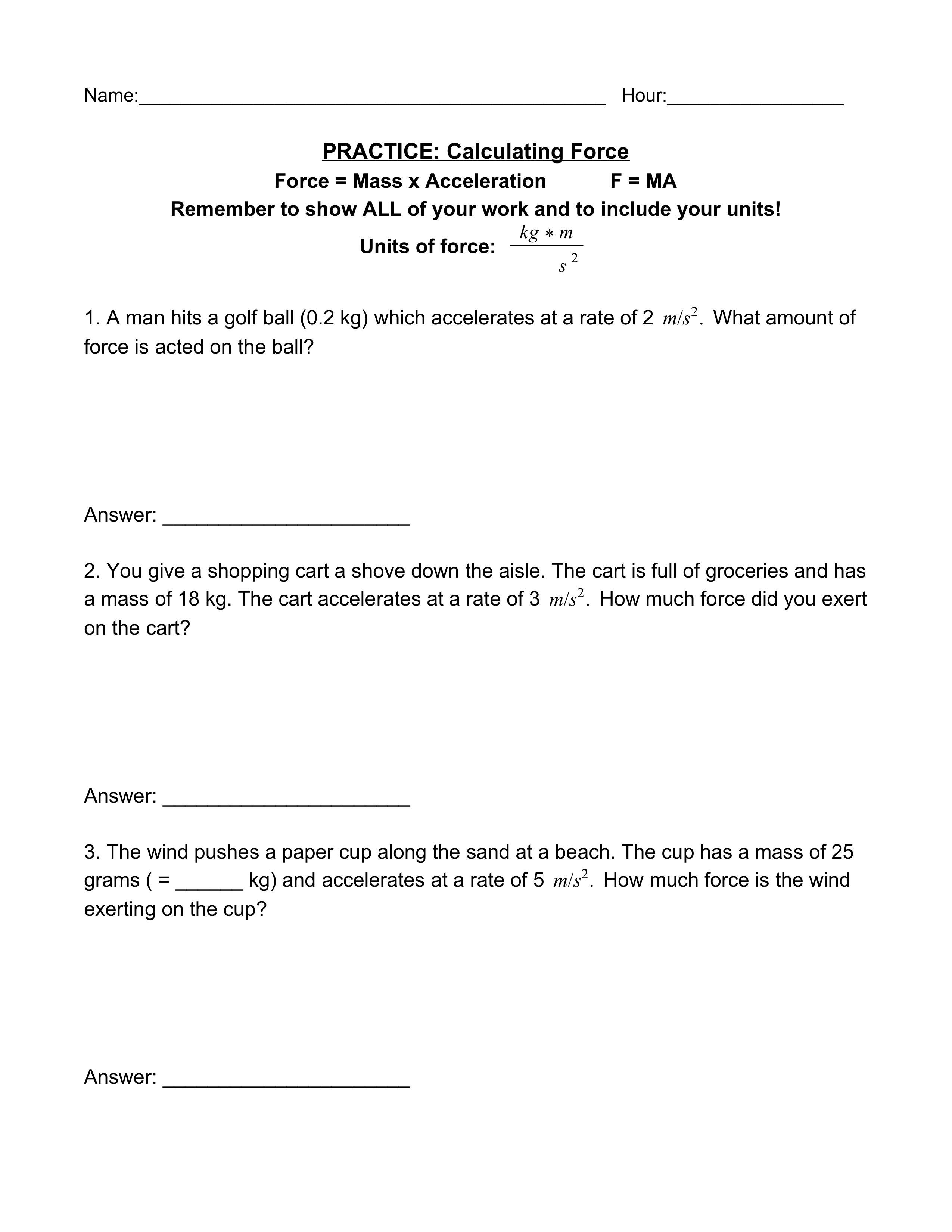 Using the formula F=MA, calculate the amount of force needed. Show your work!