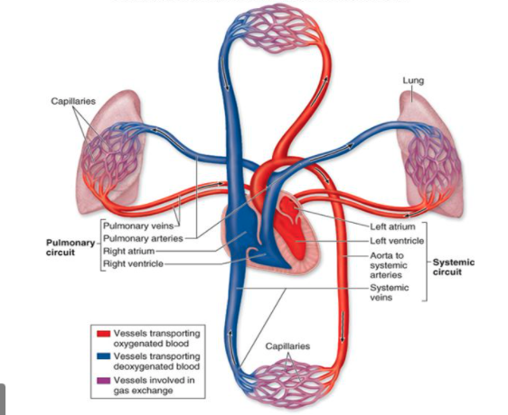 then the blood floows through the pulmanary viens back to the left atrium of the heart and the process repeats