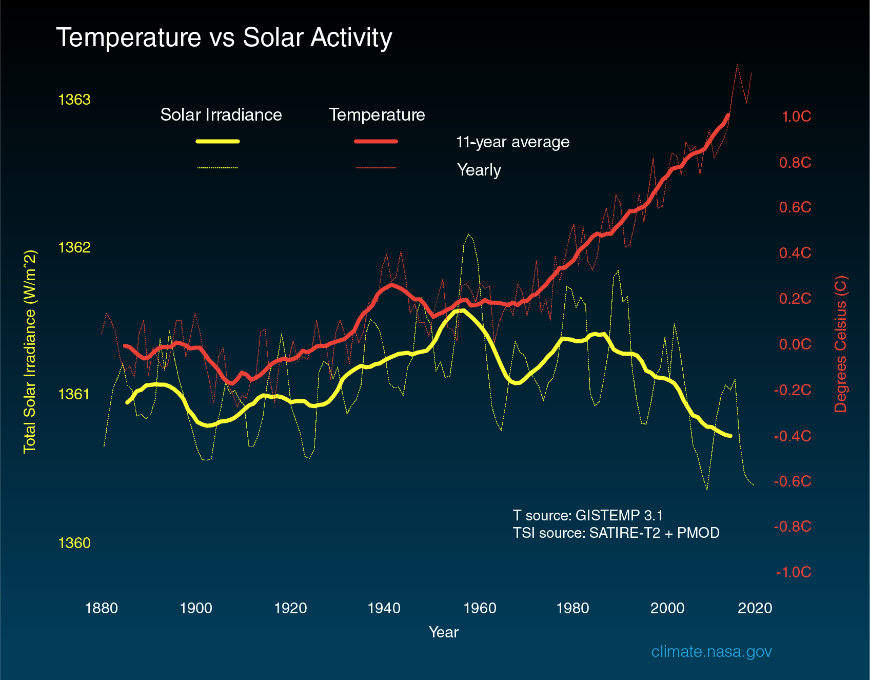 Answer after looking at the above graph and reading the description below it: Why does the graph include the 11 year averages of the sun's yearly irradiance and global temperatures?