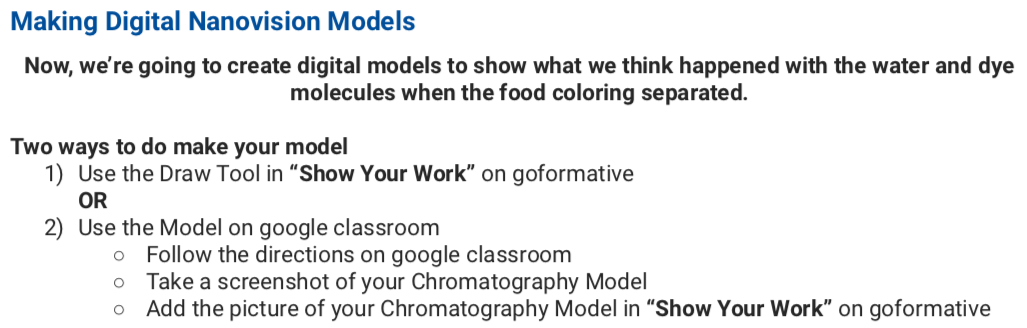 - Add the picture of your Chromatography Model in “Show Your Work” on goformative