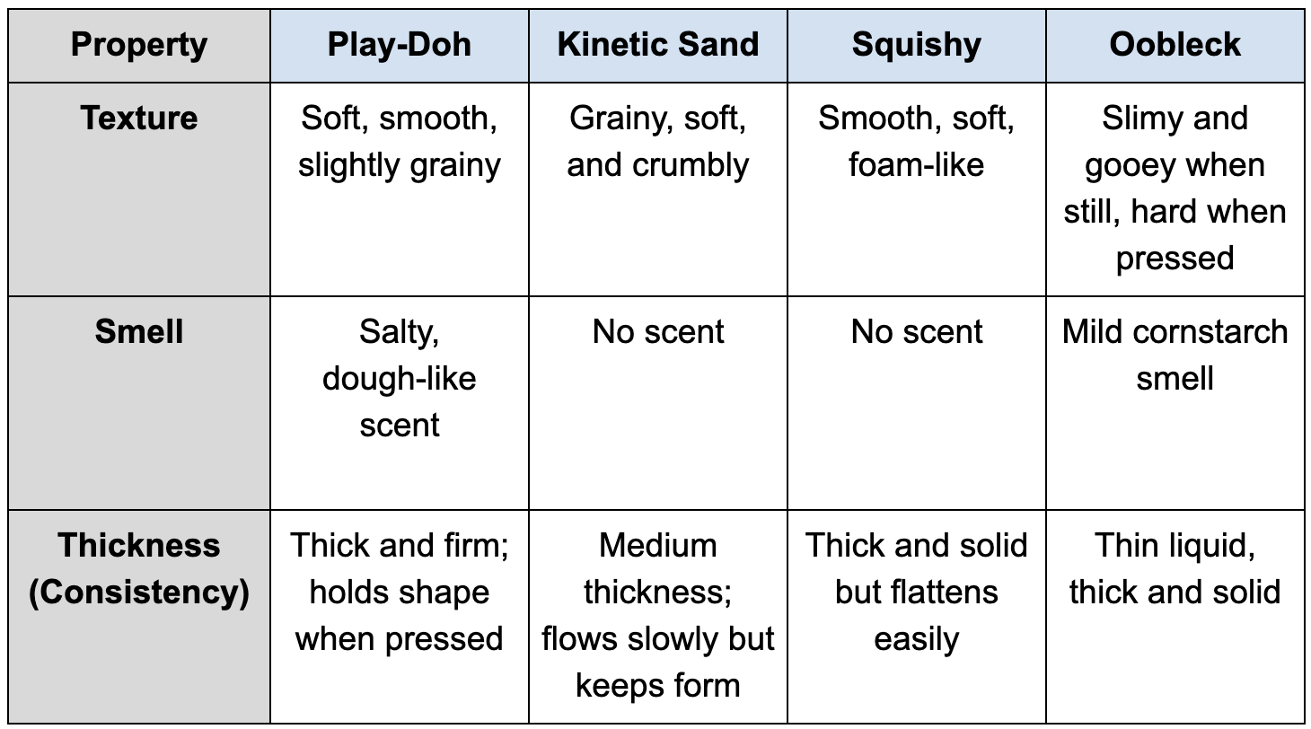 💚 Properties of Substance 3:Texture - Soft, smooth, slightly grainySmell - Salty, dough-like scentConsistency - Thick and firm; holds shape when pressed