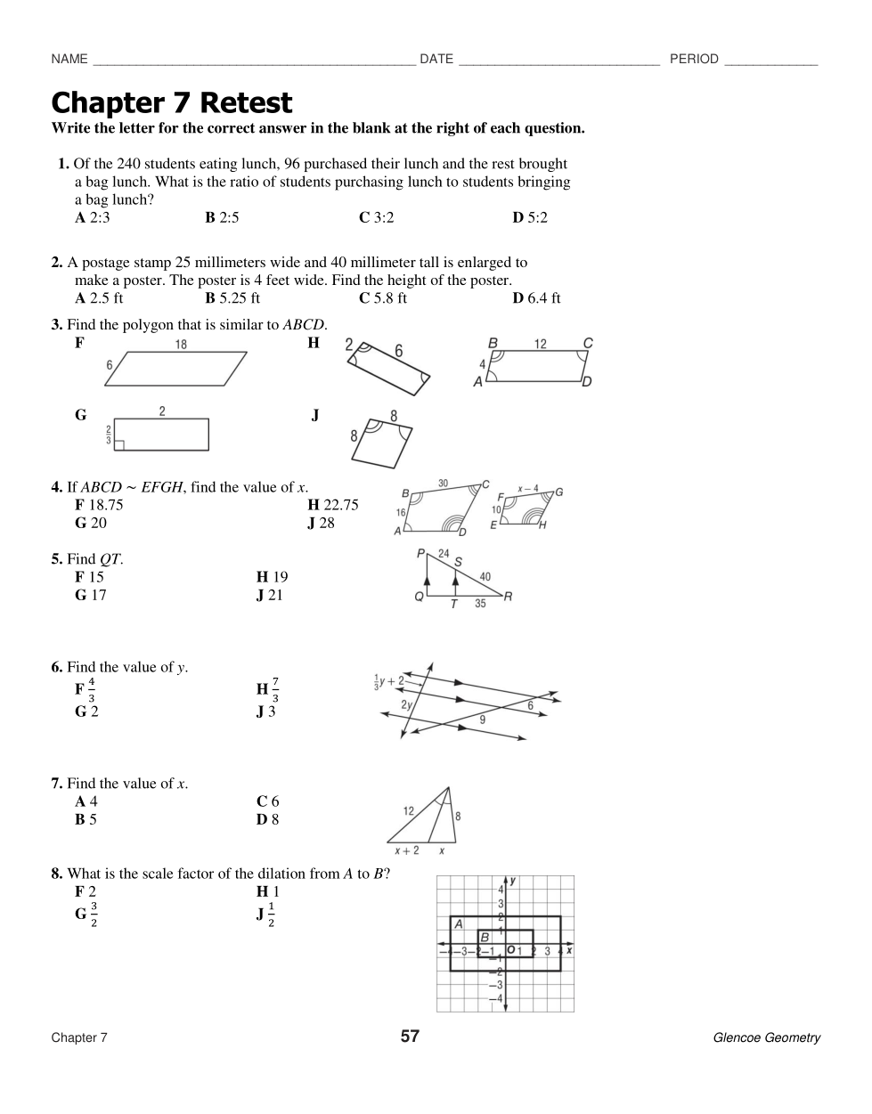 2. A postage stamp 25 millimeters wide and 40 millimeters tall is enlarged to make a poster. The poster is 4 feet wide. Find the height of the poster.