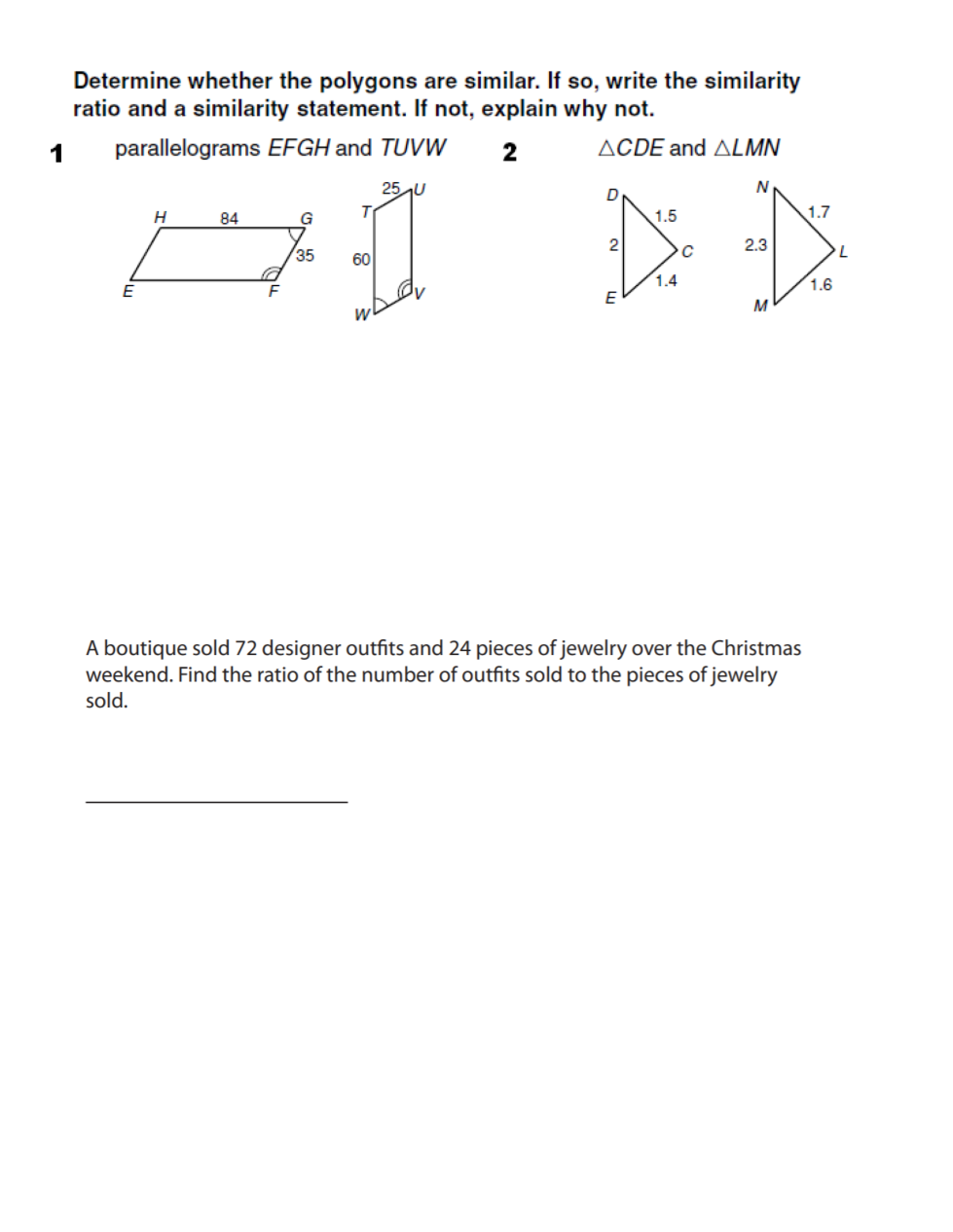 1. Of the 240 students eating lunch, 96 purchased their lunch and the rest brought a bag lunch. What is the ratio of students purchasing lunch to students bringing a bag lunch?