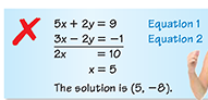 4x – 3y = 31 –7x + 9y = –58 | arrow_right_alt | substitution |