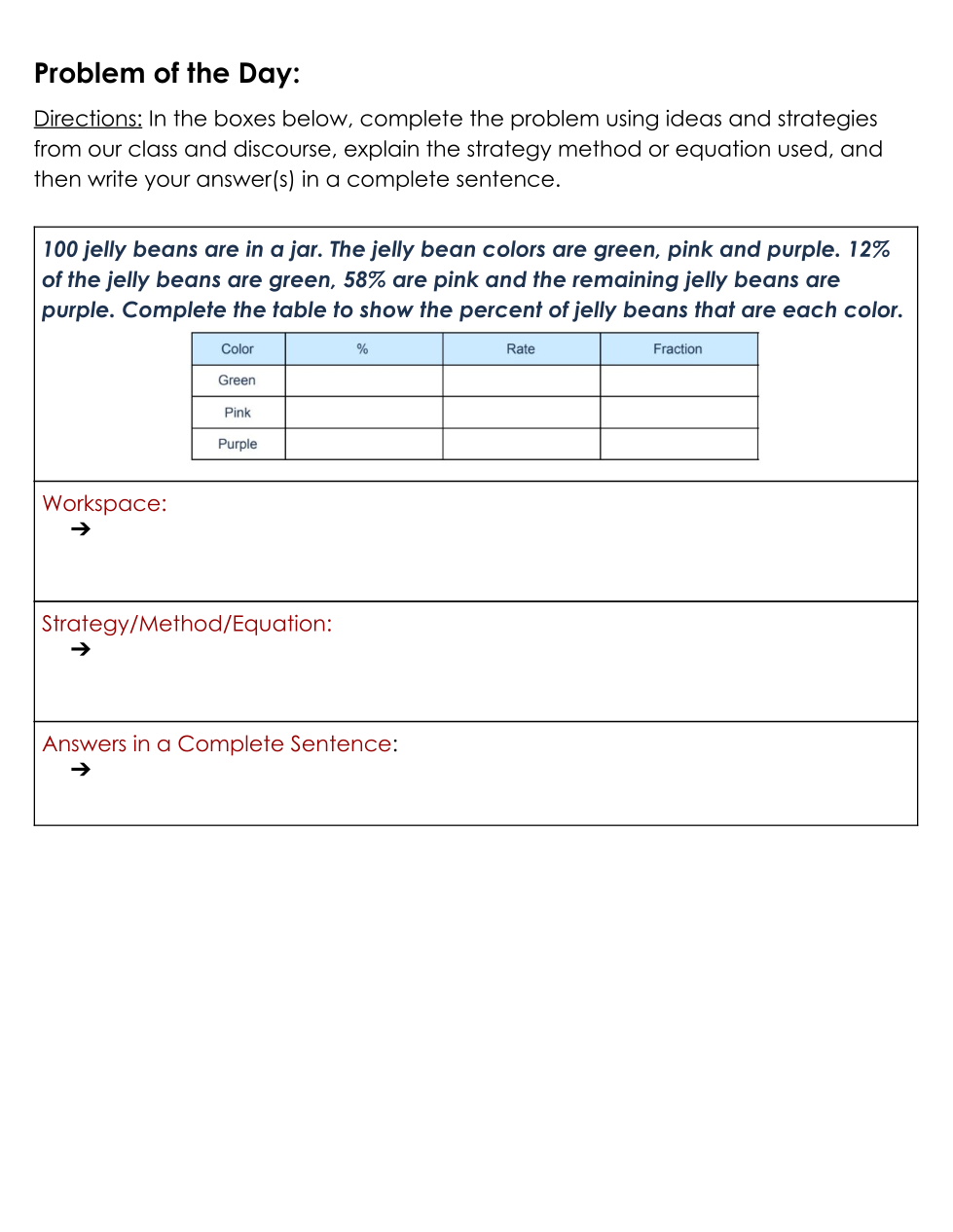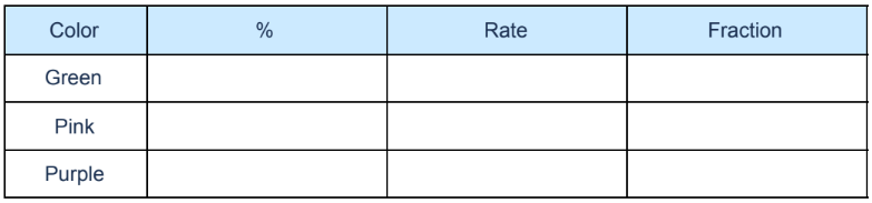 100 jelly beans are in a jar. The jelly bean colors are green, pink and purple. 12% of the jelly beans are green, 58% are pink and the remaining jelly beans are purple. Complete the table to show the percent of jelly beans that are each color.