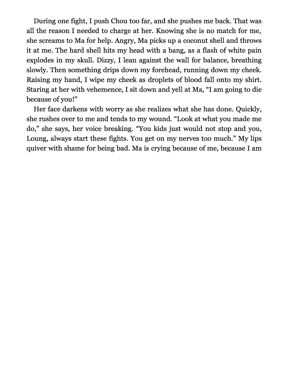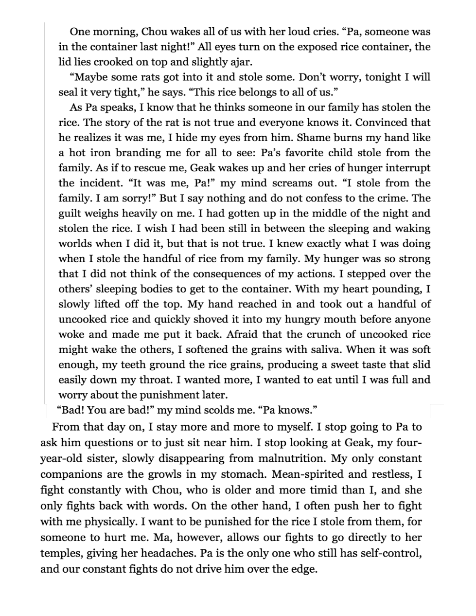 Directions: Think about Loung's guilt after she steals a handful of rice. Can you recall a time you felt guilty for or about something as a child? Include the following in your answer:
