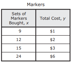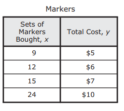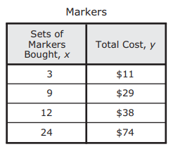 Which table shows the relationship between x, the number of sets of markers bought by the teacher, and y, the total cost of the markers?
