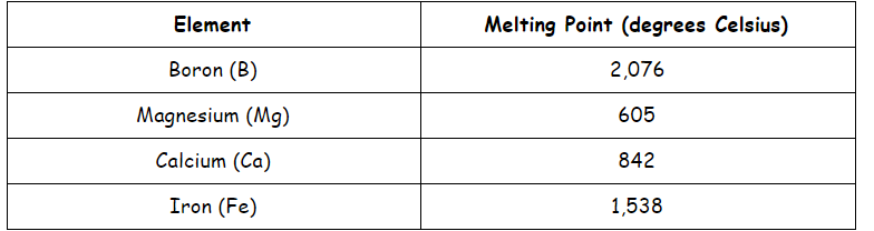 A group of scientists are studying how elements change from solids to liquids. They create small bricks of boron, magnesium, calcium, and iron, Each brick is 1 cm cubed. They place the bricks in an oven and gradually heat them to 1,000 degrees Celsius. At that temperature, which pair of bricks will still be in a solid state?