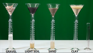 Using the picture below or the sample in class, it's time to determine the percentage of sand, silt, and clay relative to the total soil level. To calculate the percentage, divide the depth of each layer of soil by the total soil depth in the jar, and multiply by 100. (Use millimeters). Because sand is the biggest particle, it falls out first, silt is the second layer because its size is between sand and clay, and the top layer is clay because it is the smallest particle.