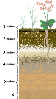 Sequence the soil horizons in the correct order from the uppermost layer (1) to the lowest layer (6).