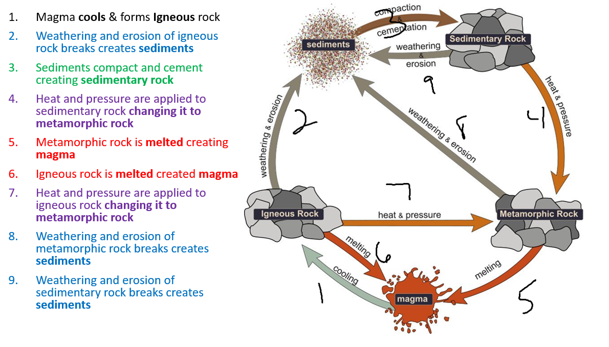 Igneous Rock | arrow_right_alt | small pieces of rock, shell, mineral made from weathing and erosion |