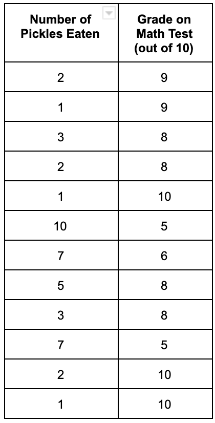 Usando Desmos, vas a crear una grafica de dispercion usando los datos de arriva. Basasdo en la grafica, parese que hayga Según el gráfico, ¿parece que existe una correlación entre la cantidad de pepinos consumidos y las calificaciones de las pruebas de matemáticas? Por qué o por qué no según lo que ves en tu calculadora.