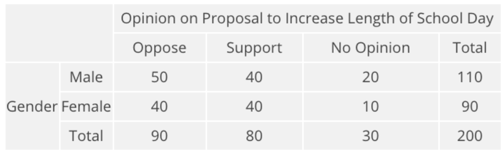 Cada estudiante en una muestra aleatoria de estudiantes en una escuela secundaria local fue categorizado según el género (masculino o femenino) y si apoyaban una propuesta para aumentar la duración de la jornada escolar en 30 minutos (oponerse, apoyar, sin opinión). La siguiente tabla resume los datos de esta muestra.