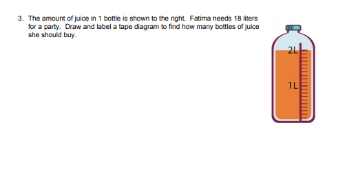 The amount of juice in 1 bottle is shown to the right. Fatima needs 18 liters for a party. Draw and label a tape diagram to find how many bottles of juice she should buy.