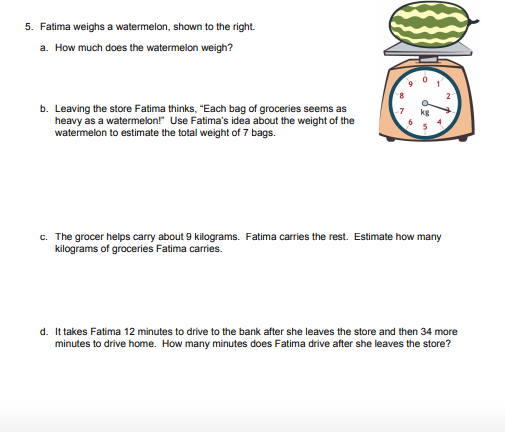 Leaving the store Fatima thinks, “Each bag of groceries seems as heavy as a watermelon!” Use Fatima’s idea about the weight of the watermelon to estimate the total weight of 7 bags.