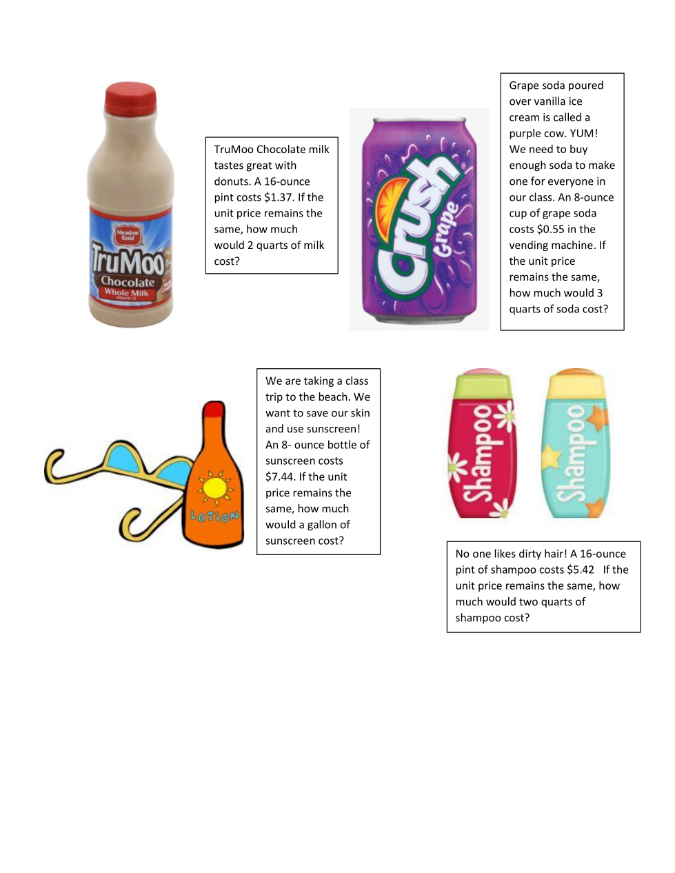 Grape soda poured over vanilla ice cream is called a purple cow. YUM! We need to buy enough soda to make one for everyone in our class. An 8-ounce cup of grape soda costs $0.55 in the vending machine. If the unit price remains the same, how much would 3 quarts of soda cost?