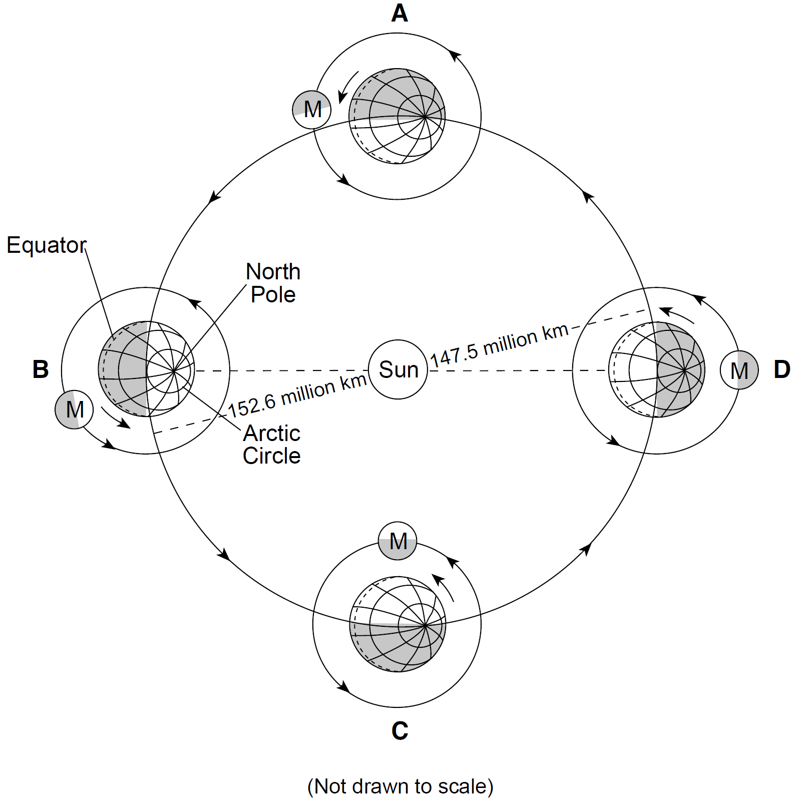 Identify the Northern Hemisphere season that is beginning at position A.