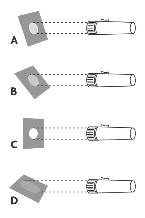 Imagine that you placed a very sensitive thermometer against the illuminated area of each piece of paper and measured its temperature. Rank the temperature (from coolest to hottest) of each illuminated area (A – D).