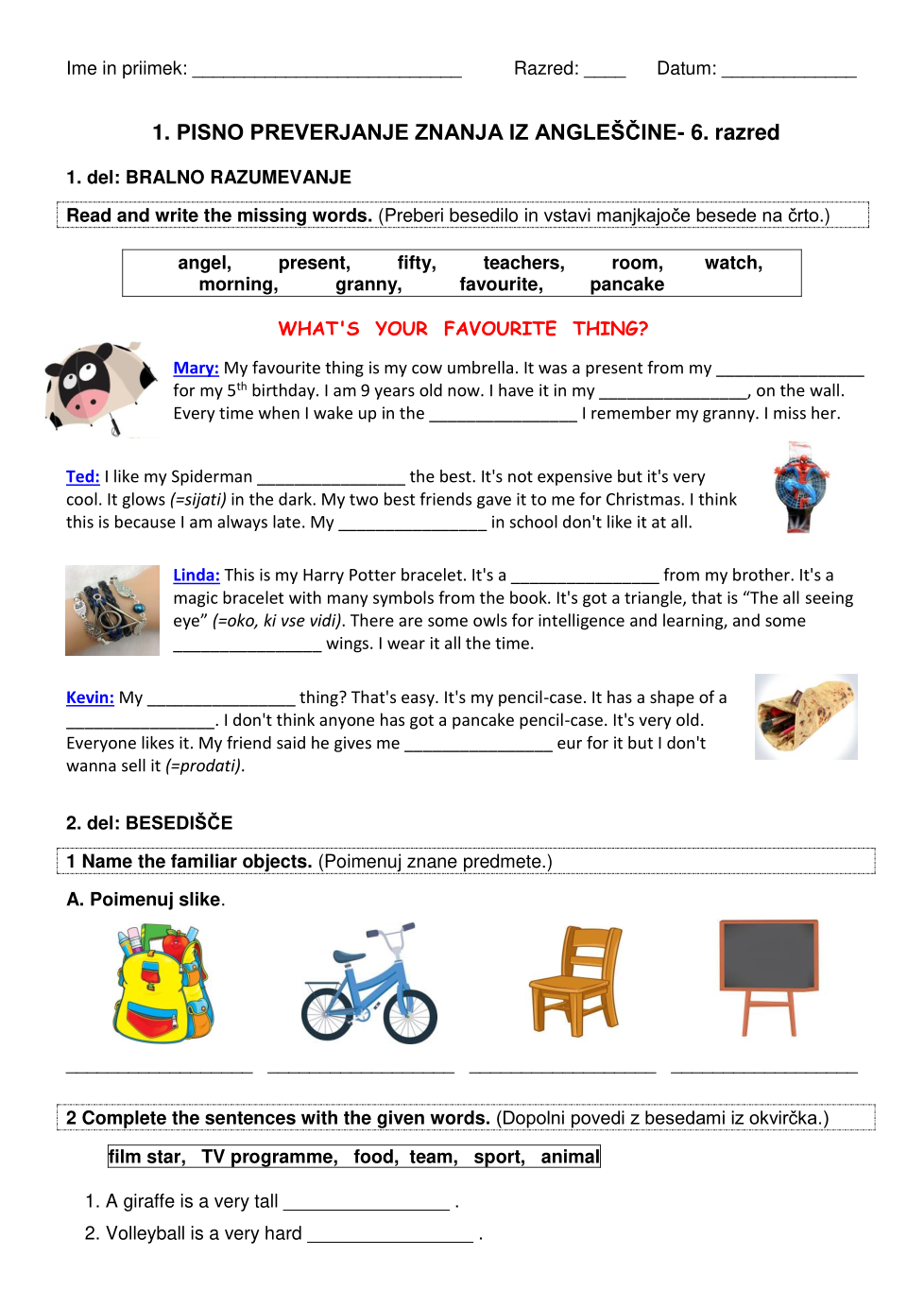 1. Pisno preverjanje znanja iz angleščine - 6. razred (2020)