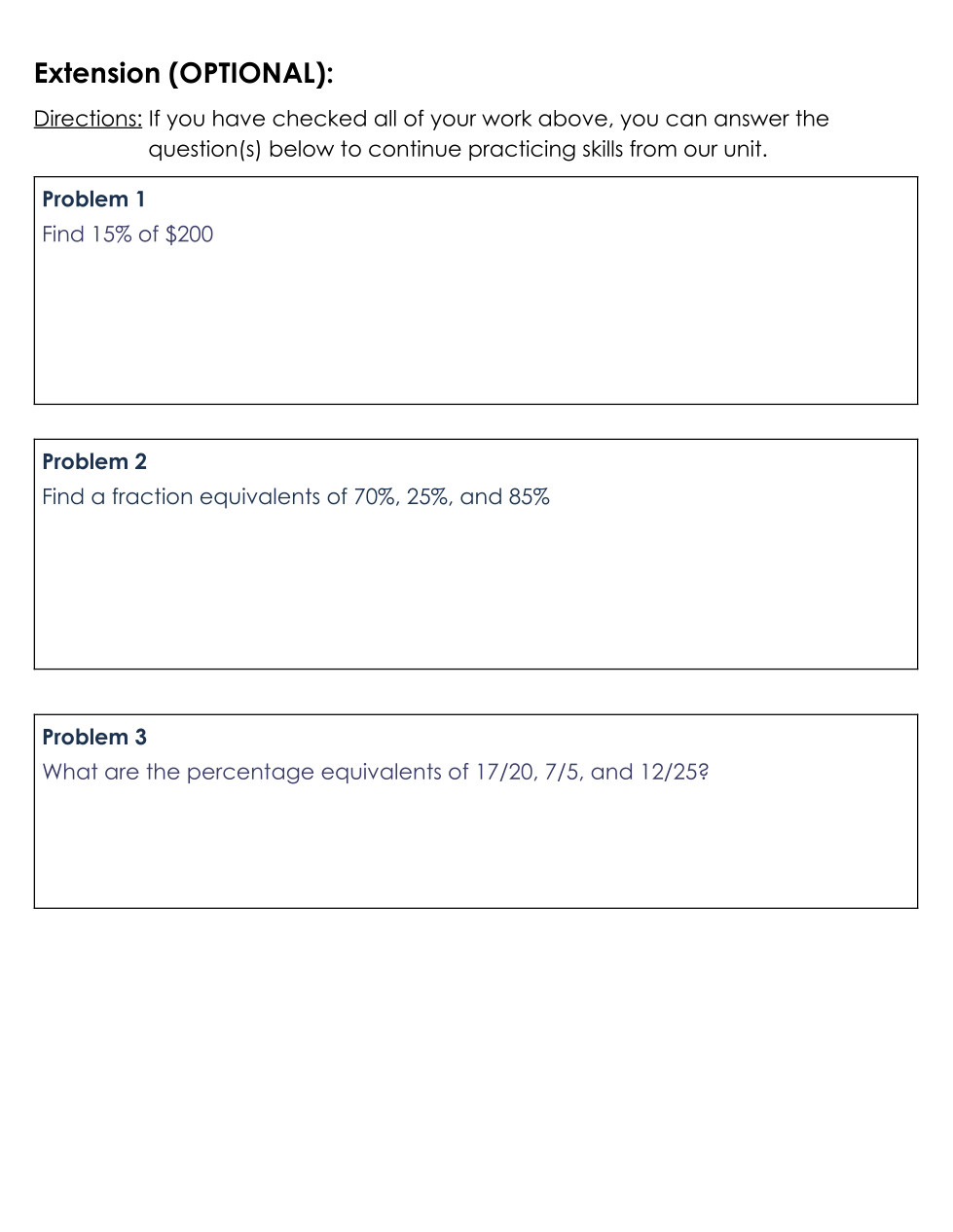 The fraction equivalent of 70% is ____, of 25% is _____, and of 85% is ____.