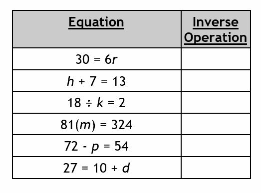 For questions #6-11, choose the inverse operation for each equation shown in the table below.