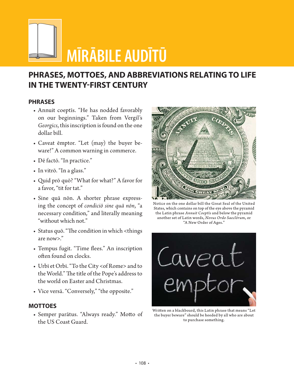 Annuit coeptīs: Taken from Vergil’s Georgics, this inscription is found on the one dollar bill. | arrow_right_alt | “Time flees.” An inscription often found on clocks. |