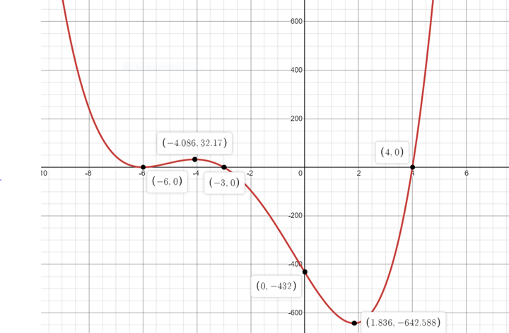 Interval where function is negative | arrow_right_alt | 0 @ x = -6 and -642.588 @ x = 1.836 |