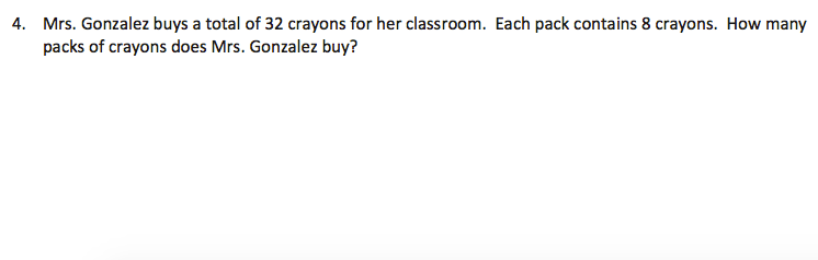 Mrs. Gonzalez buys a total of 32 crayons for her classroom. Each pack contains 8 crayons. How many packs of crayons does Mrs. Gonzalez buy?