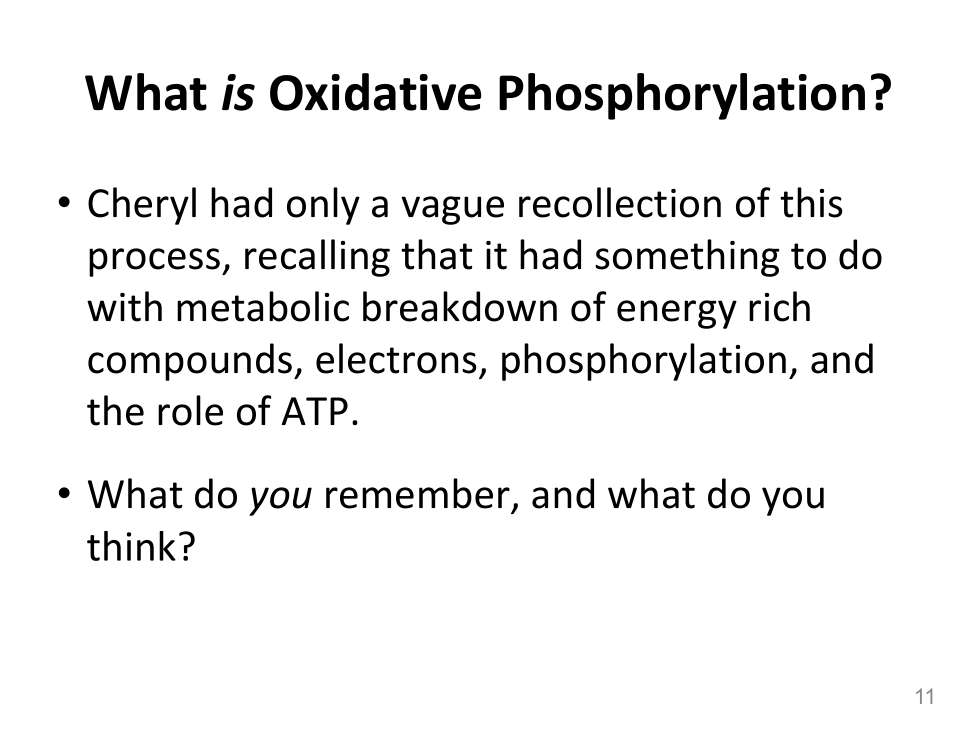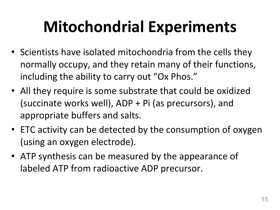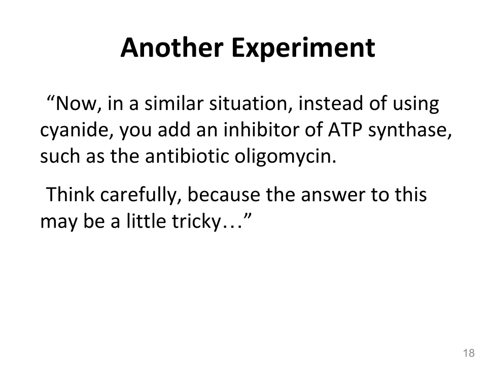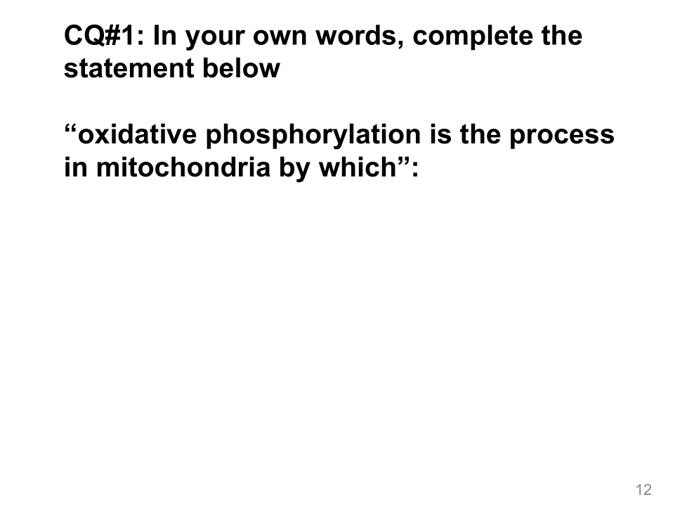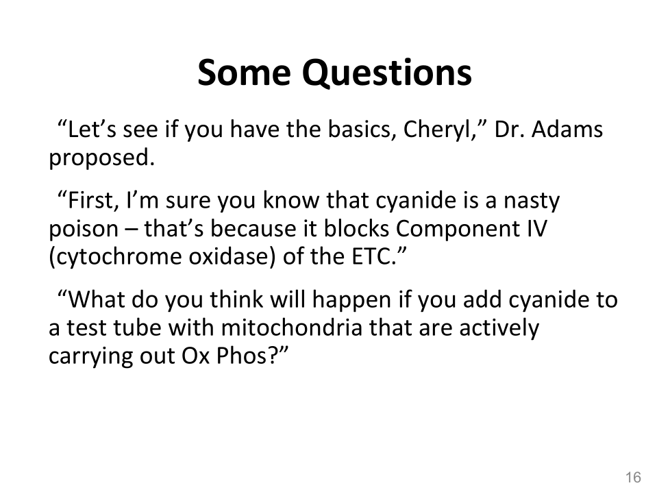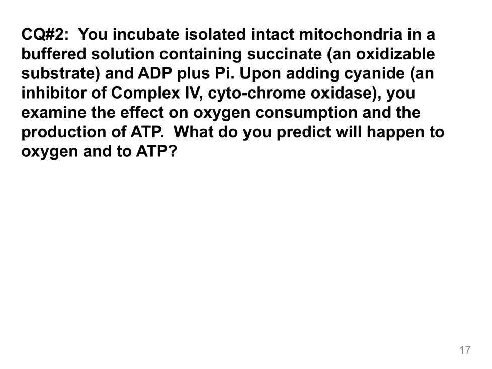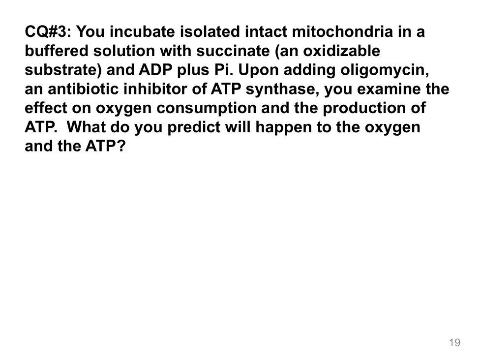 What do you predict will happen here? Write a summarizing statement AND draw out a graph. Use the axes provided. What will happen to the graph when succinate is added to the ADP + P in solution? What would then happen when cyanide is added? You should have 2 lines on the graph - one for oxygen consumed and one for amount of ATP synthesized. I would suggest graphing what happens to amount of ATP synthesized, and then graph O2 consumed.