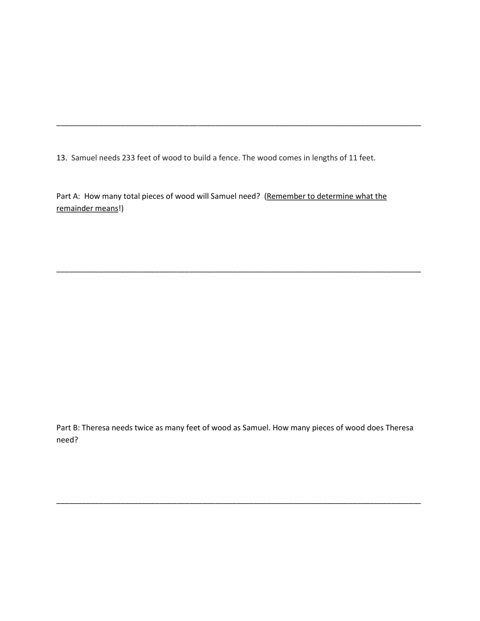Part A: How many total pieces of wood will Samuel need? (Remember to determine what the remainder means!)_____________________________________________________________________________________Part B: Theresa needs twice as many feet of wood as Samuel. How many pieces of wood does Theresa need?_____________________________________________________________________________________