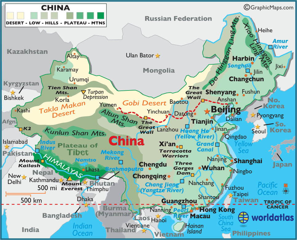 The Gobi Desert is a geographic feature of China that acts as a natural barrier to the north. It is slightly northeast of Mongolia on this map.