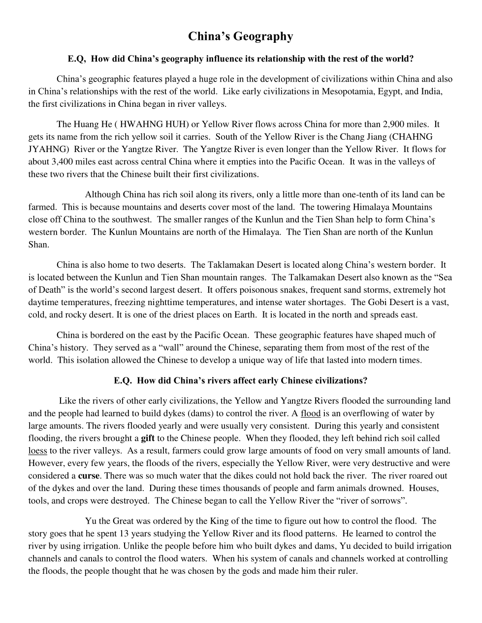 After watching the video on the Yellowy (Huang He) River, explain one way this geographic feature could help, or support, the development of civilization in China