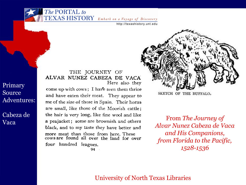 Cabeza de Vaca called buffalos “cows”. How did he describe their hair and meat?