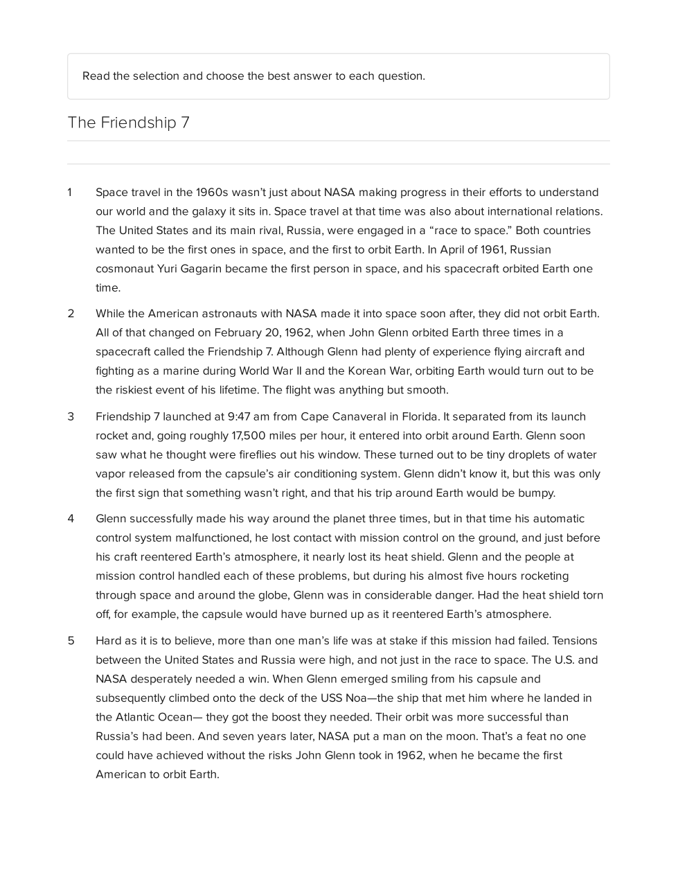 Read paragraph 1 from the selection. Choose the phrase that best demonstrates why the U.S. andRussia were in a “race to space.”