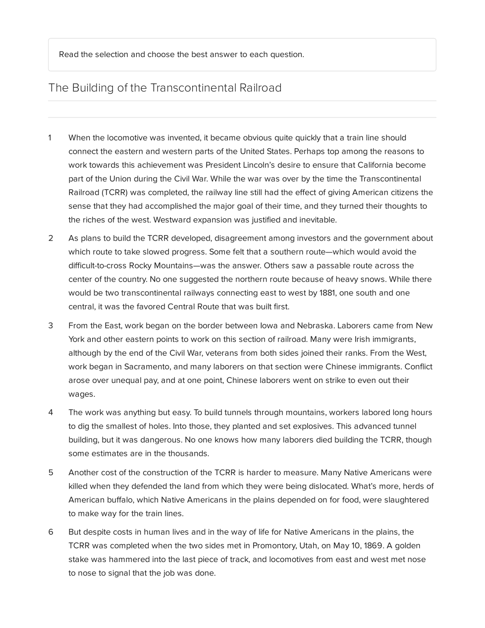 Which sentence from the selection best demonstrates that the Transcontinental Railroad was an