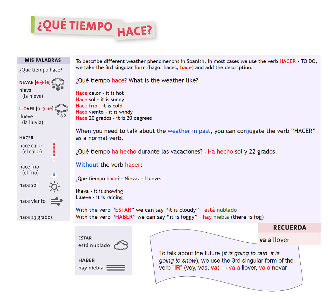 Weather in pretérito perfecto:(HACER - Ha hecho sol, ha hecho frio, ha hecho calor, ESTAR - ha estado nublado, HABER - ha habido niebla, LLOVER - ha llovido, NEVAR - ha nevado)
