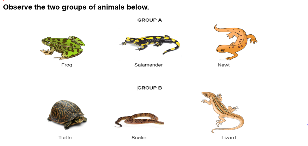 B. The animals in GROUP A are mammals. The animals in GROUP B are reptiles.