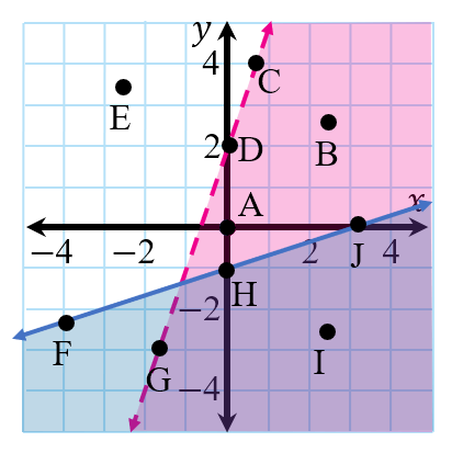 Given the system of linear inequaliites graphed below, which points could be solutions?