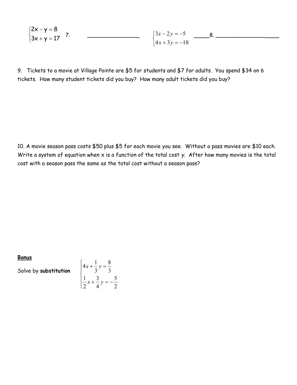 9. Tickets to a movie at Village Pointe are $5 for students and $7 for adults. You spend $34 on 6 tickets. How many student tickets did you buy? How many adult tickets did you buy?