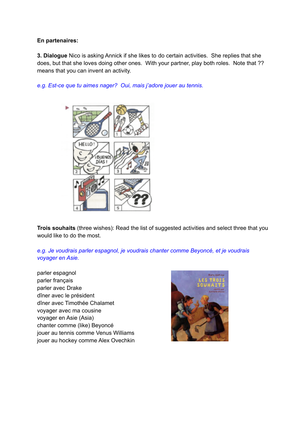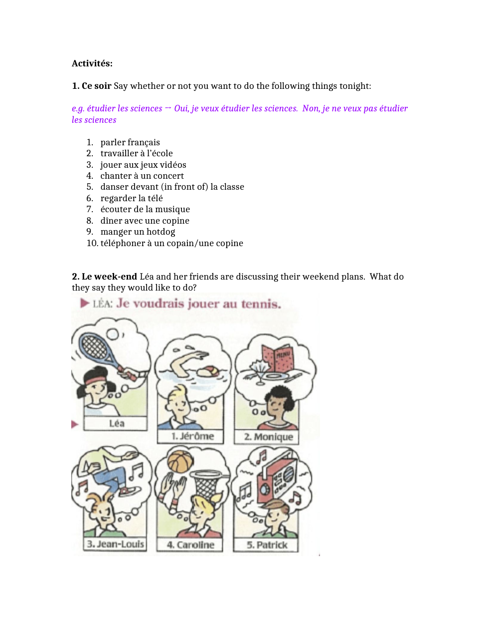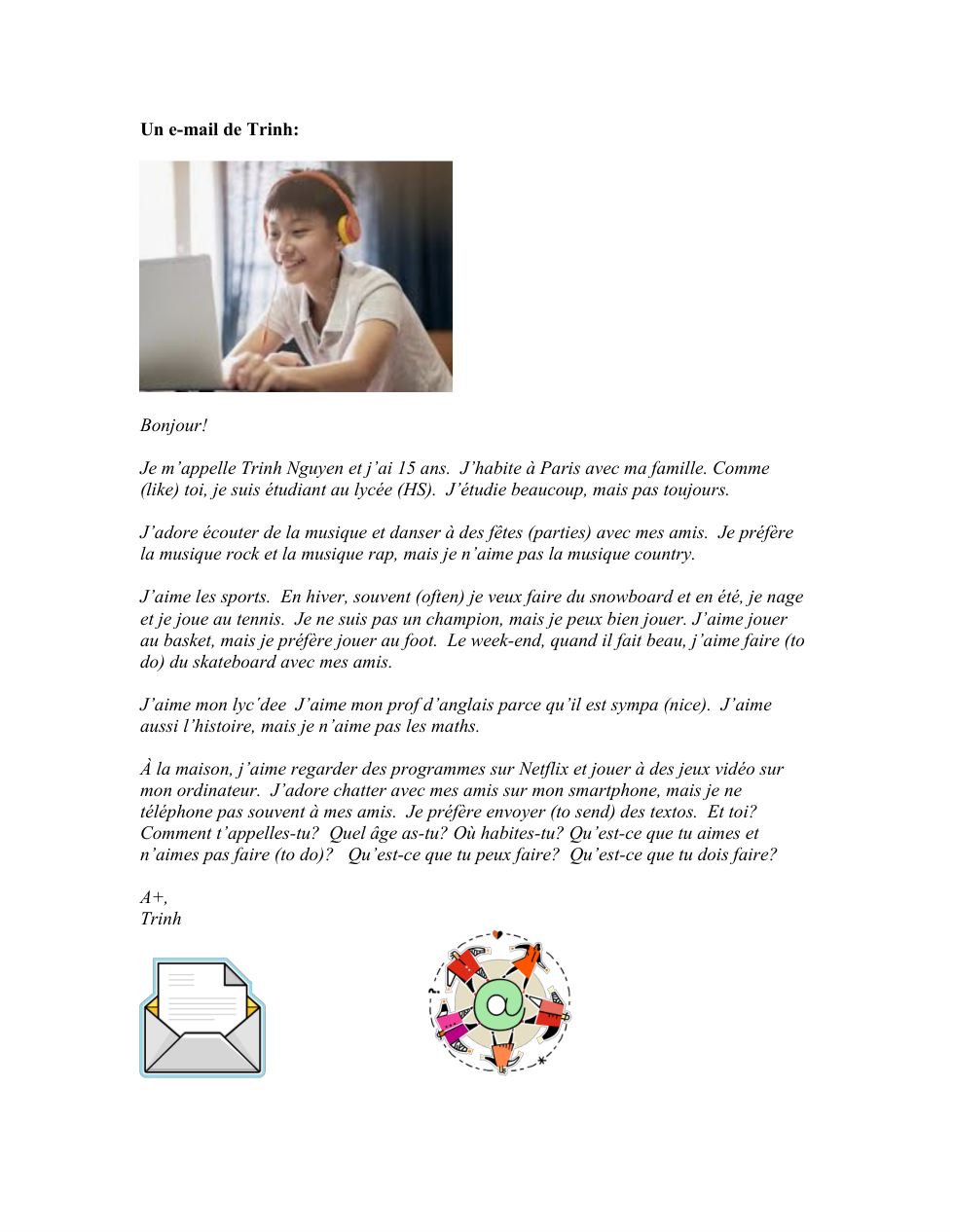 Maintenant, écrivez (write) une réponse à Trinh! Présentez à la fin de la classe . Utilisez seulement (only) j’aime/je n’aime pas, je veux, je ne veux pas, je peux, je dois + infinitifs. Incluez (include) une question à la fin (end) aussi.